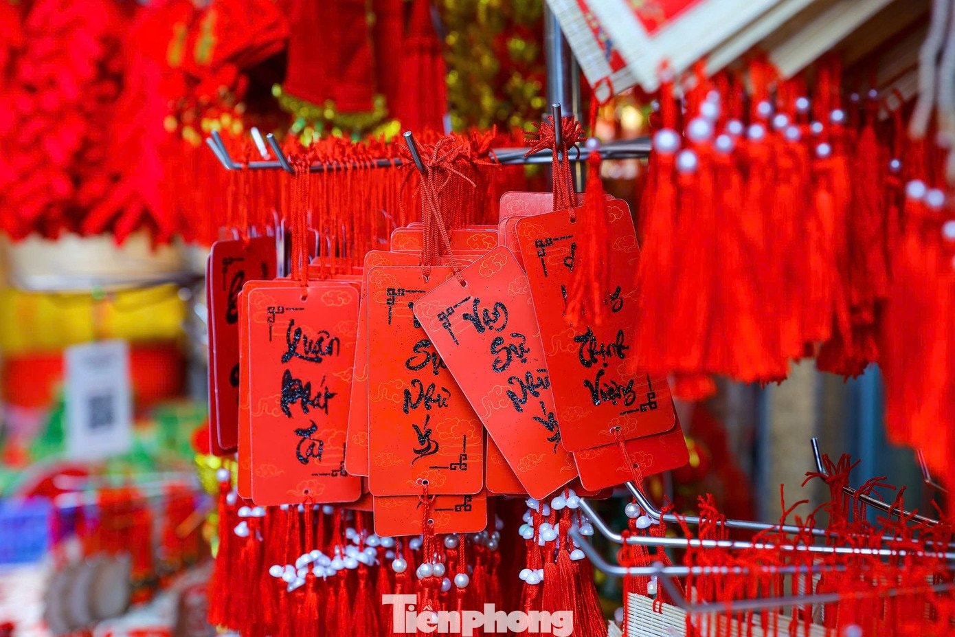 Sắc đỏ không chỉ phủ kín các sạp hàng mà còn len lỏi vào từng ngõ nhỏ. Những vật phẩm trang trí kích thước nhỏ, mang ý nghĩa phong thủy về may mắn và tài lộc năm nay đặc biệt thu hút sự quan tâm của khách hàng vì tính tiện dụng và thẩm mỹ cao.