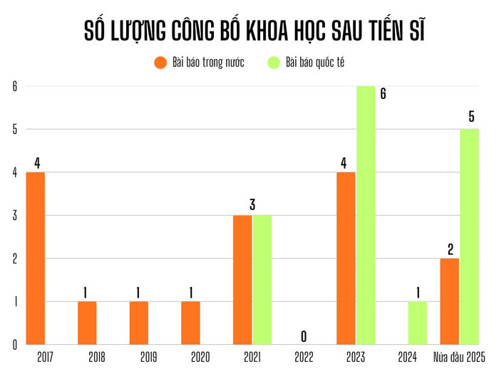 Tính riêng số lượng công bố khoa học sau tiến sĩ (từ năm 2017), cô Huyền có 15 công bố quốc tế và 16 công bố trong nước. Trong đó, riêng nửa đầu năm 2025, cô Huyền có 5 công bố quốc tế và 2 công bố trong nước.
