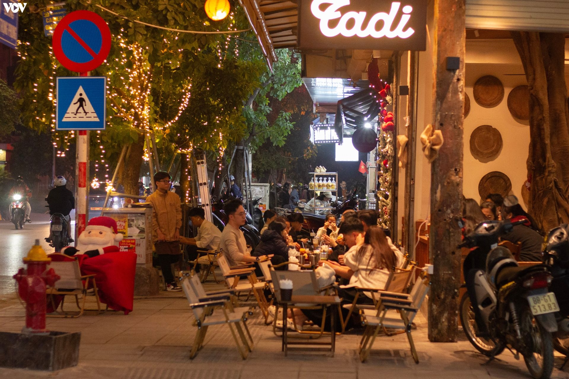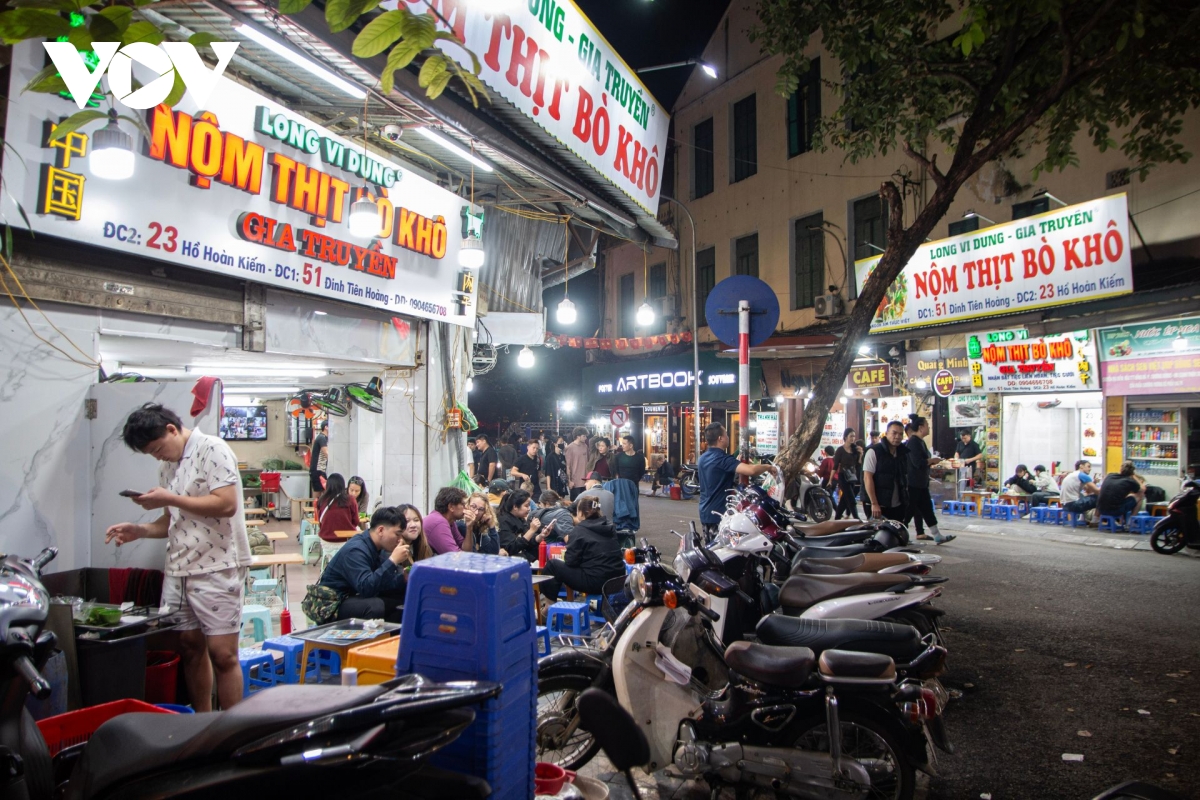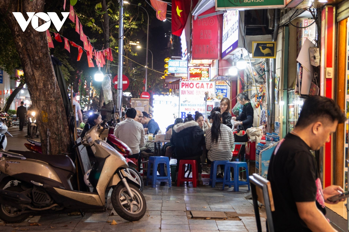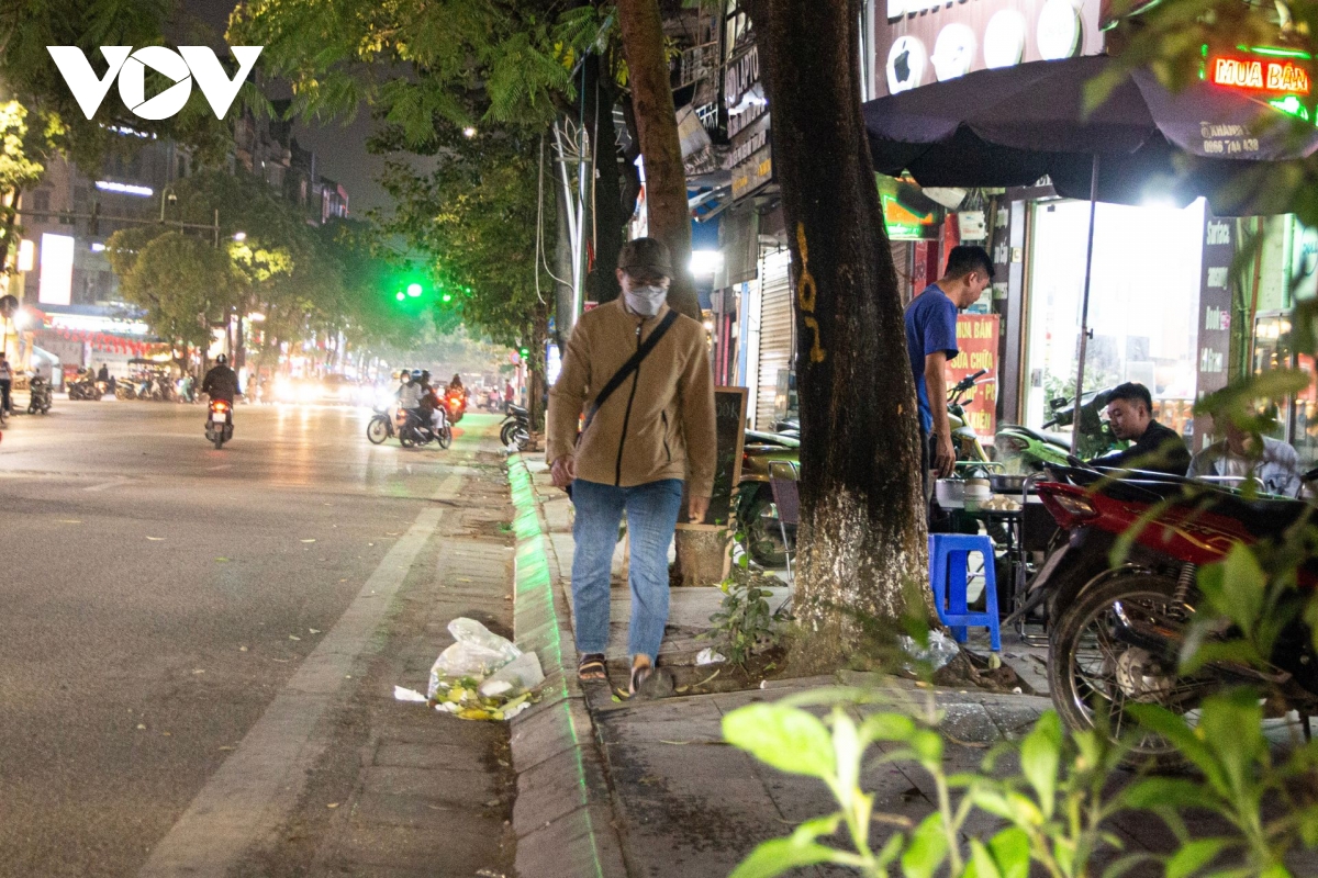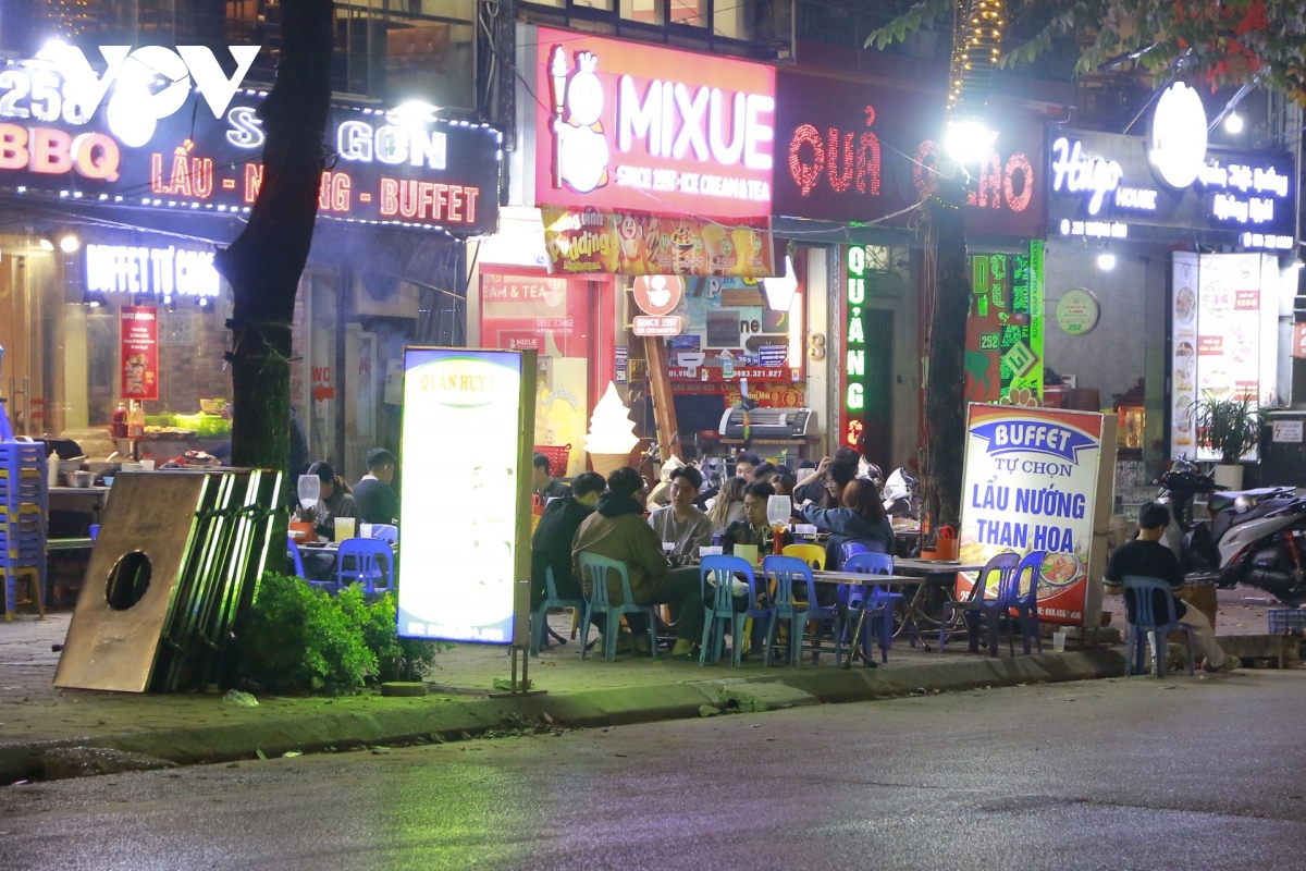 Tối 8/12, phóng viên đã ghi nhận tại nhiều tuyến phố trung tâm trên địa bàn Thủ đô như: phố Cầu Gỗ, phố Hồ Hoàn Kiếm, phố Hàng Thùng,.... Nhiều hàng quán vẫn đặt dãy bàn sát mép đường, khách ngồi san sát, xe máy dựng tràn lan khiến người đi bộ không còn lối đi.