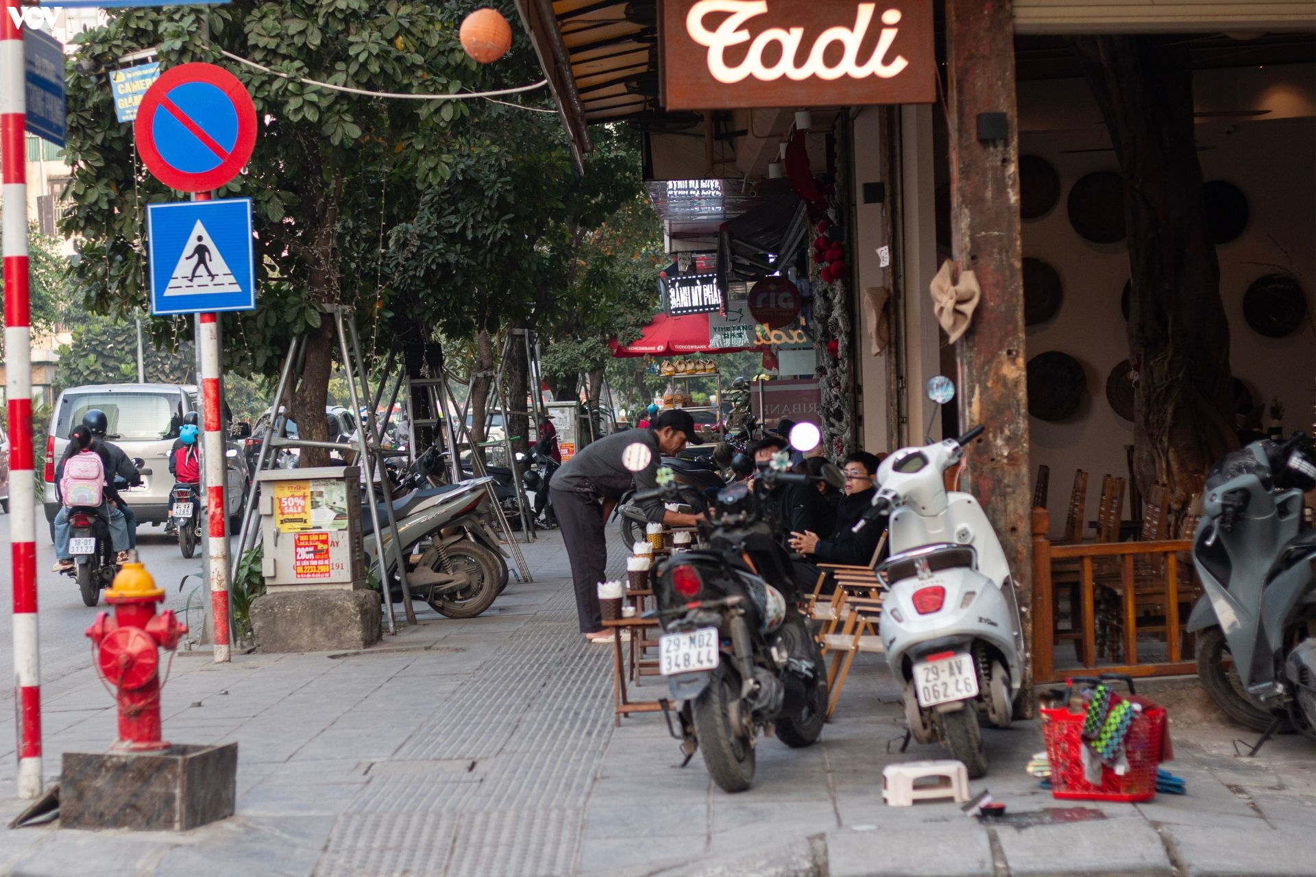 Cách đó chừng 50m, cũng tại một quán cà phê dọc trục đường Vũ Trọng Phụng, bàn ghế bày ra để cho khách ngồi uống nước trên vỉa hè. Lối đi cho người đi bộ, người khuyết tật bị thu hẹp lại.