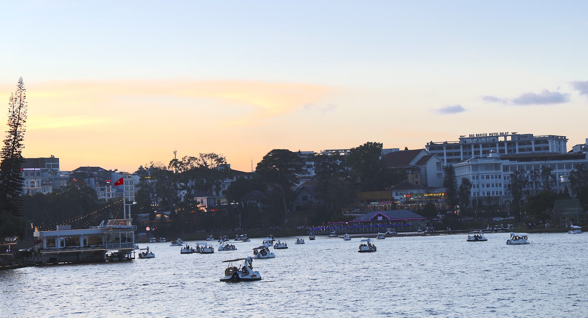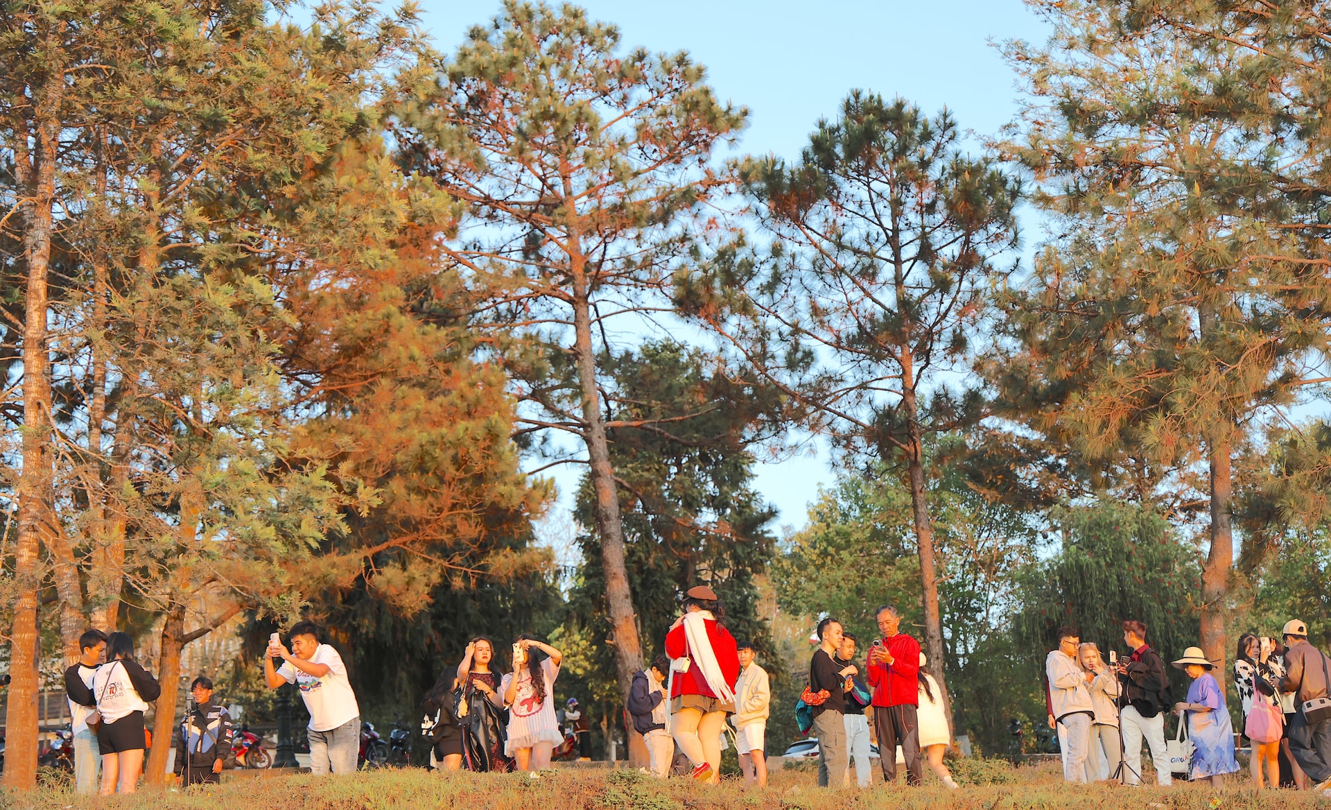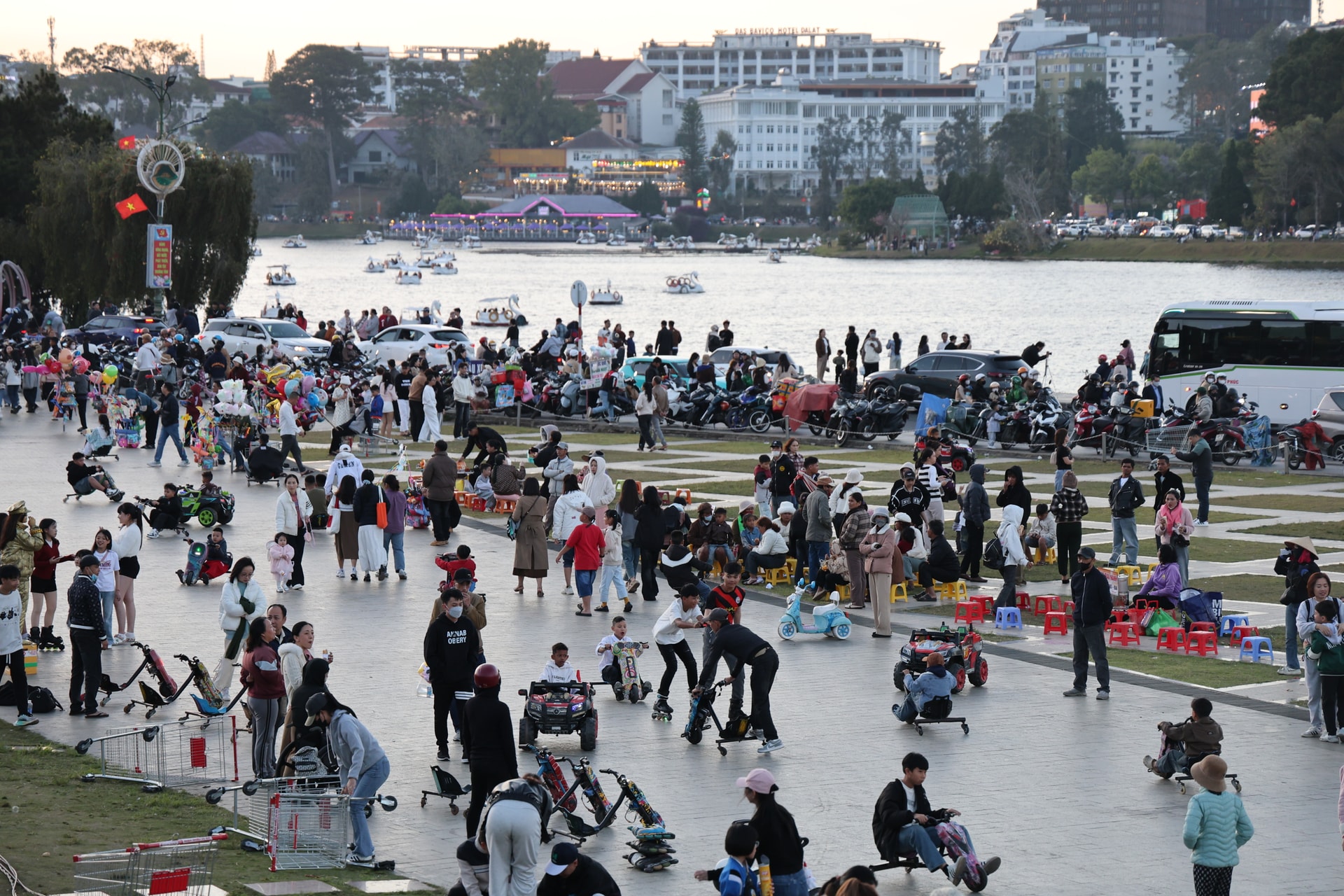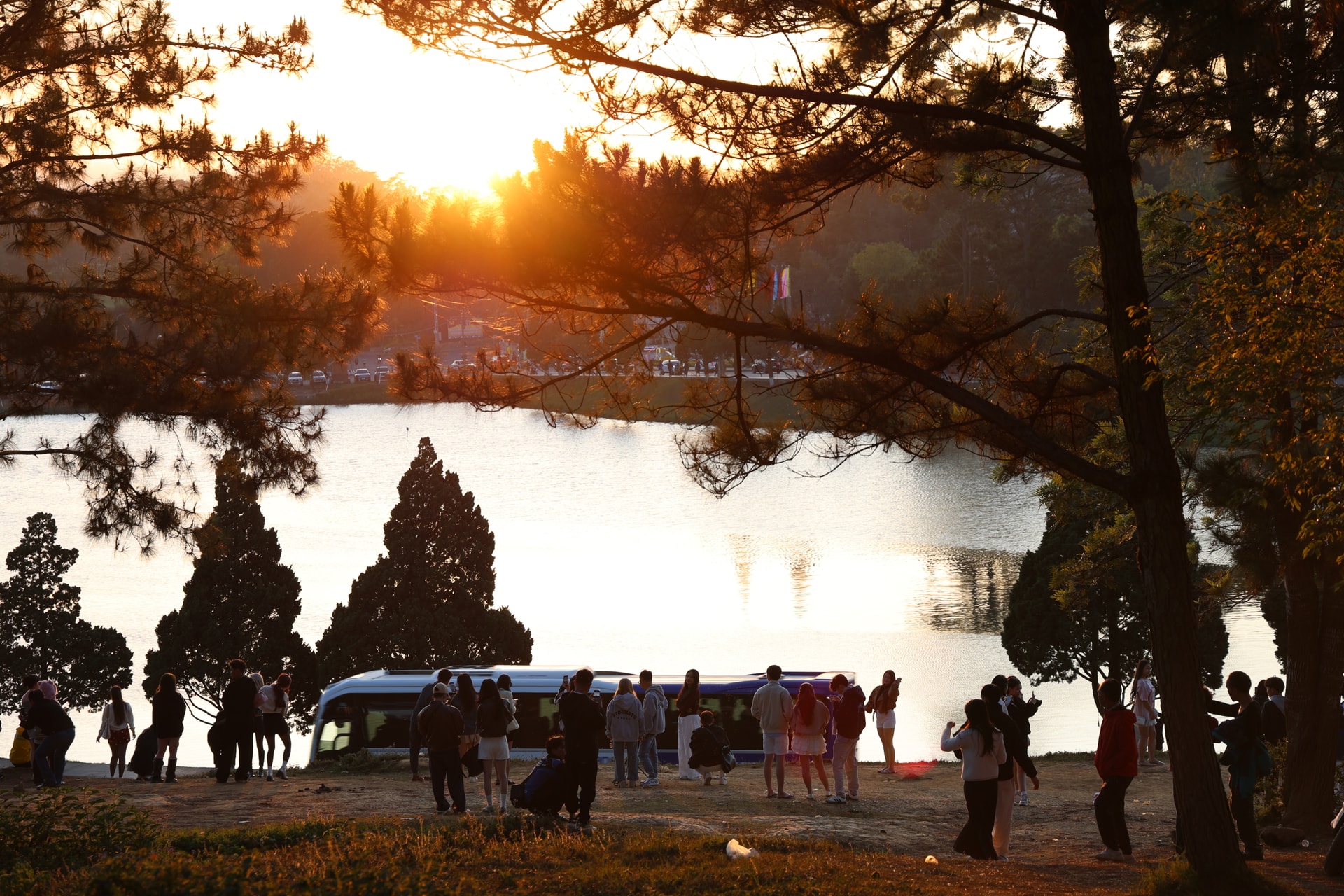 Vào buổi chiều, các vị trí cao ven hồ trở thành điểm ngắm cảnh lý tưởng, nơi nhiều người dừng chân thưởng ngoạn vẻ đẹp hoàng hôn và lưu lại những khoảnh khắc đầu năm.