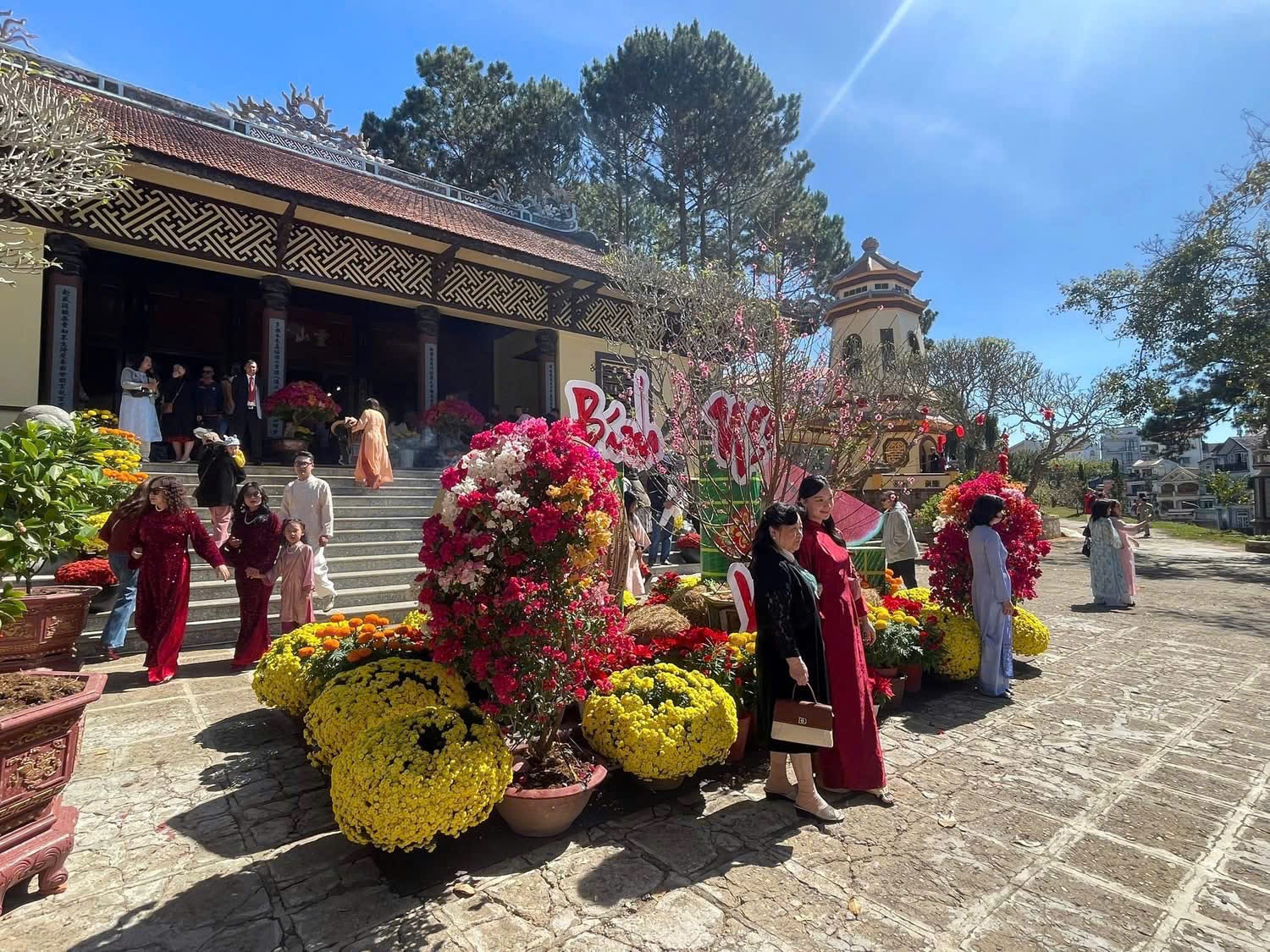 Du khách vãn cảnh, chụp hình tại chùa Linh Sơn (phường Xuân Hương - Đà Lạt)