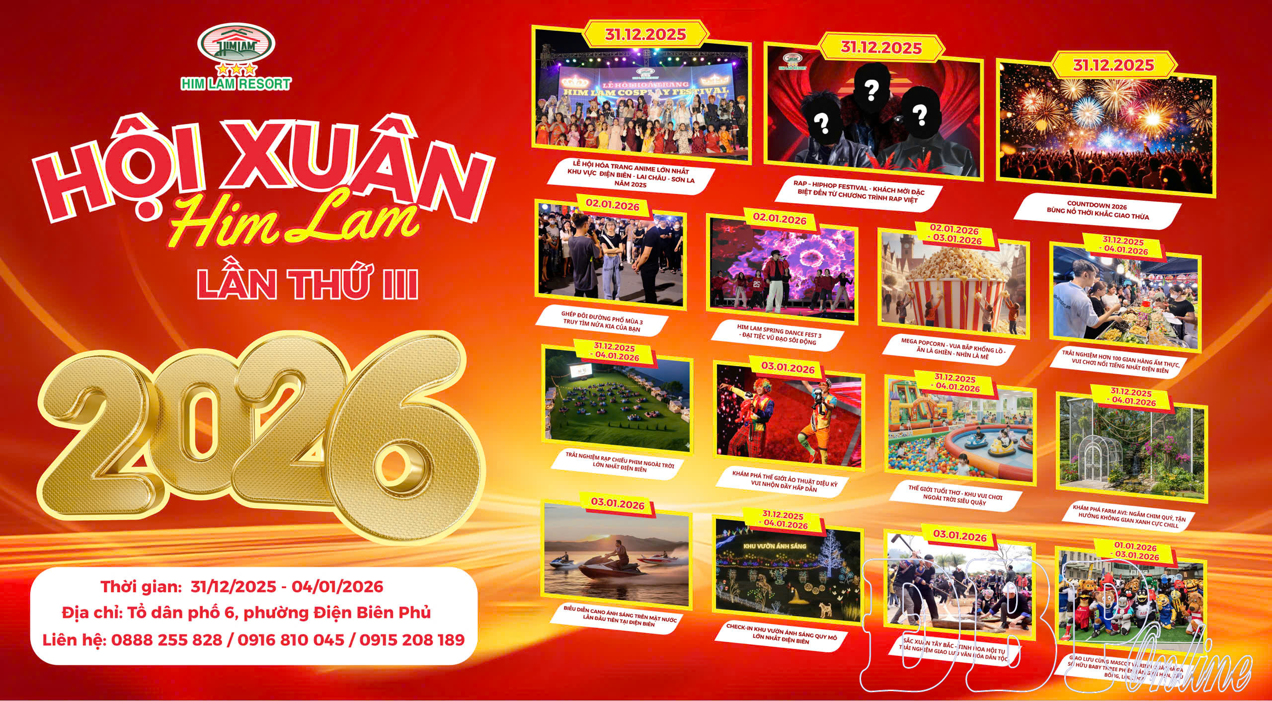 Không khí đón năm mới tại Điện Biên Phủ tiếp tục được nối dài trong những ngày đầu năm 2026 với Hội Xuân Him Lam lần thứ III - 2026, diễn ra từ 31/12/2025 đến 4/1/2026 tại khu vực tổ dân phố 6, phường Điện Biên Phủ, do Him Lam Resort tổ chức. Sự kiện được xem là một trong những điểm nhấn vui xuân quy mô lớn, góp phần làm phong phú thêm bức tranh lễ hội của thành phố trong dịp đầu năm mới. Ngay trong tối 31/12/2025, không gian lễ hội sẽ sôi động với Rap - Hiphop Festival, quy tụ những khách mời đặc biệt đến từ các chương trình rap Việt Nam, mang đến sắc màu trẻ trung, hiện đại cho đêm cuối năm.