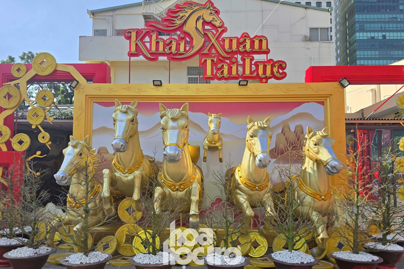 Bên phải sân khấu chính là khu vực "Khai Xuân Hỷ Lực" với hình ảnh chú bạch mã tung vó đầy năng lượng. Đối xứng phía bên trái, cụm "Khai Xuân Tài Lực" tái hiện hình ảnh gia đình ngựa gồm 6 thành viên (5 ngựa lớn, 1 ngựa bé) quây quần, biểu trưng cho sự sung túc và đoàn viên trong dịp Tết cổ truyền.