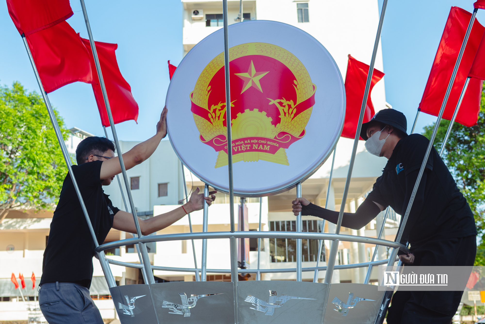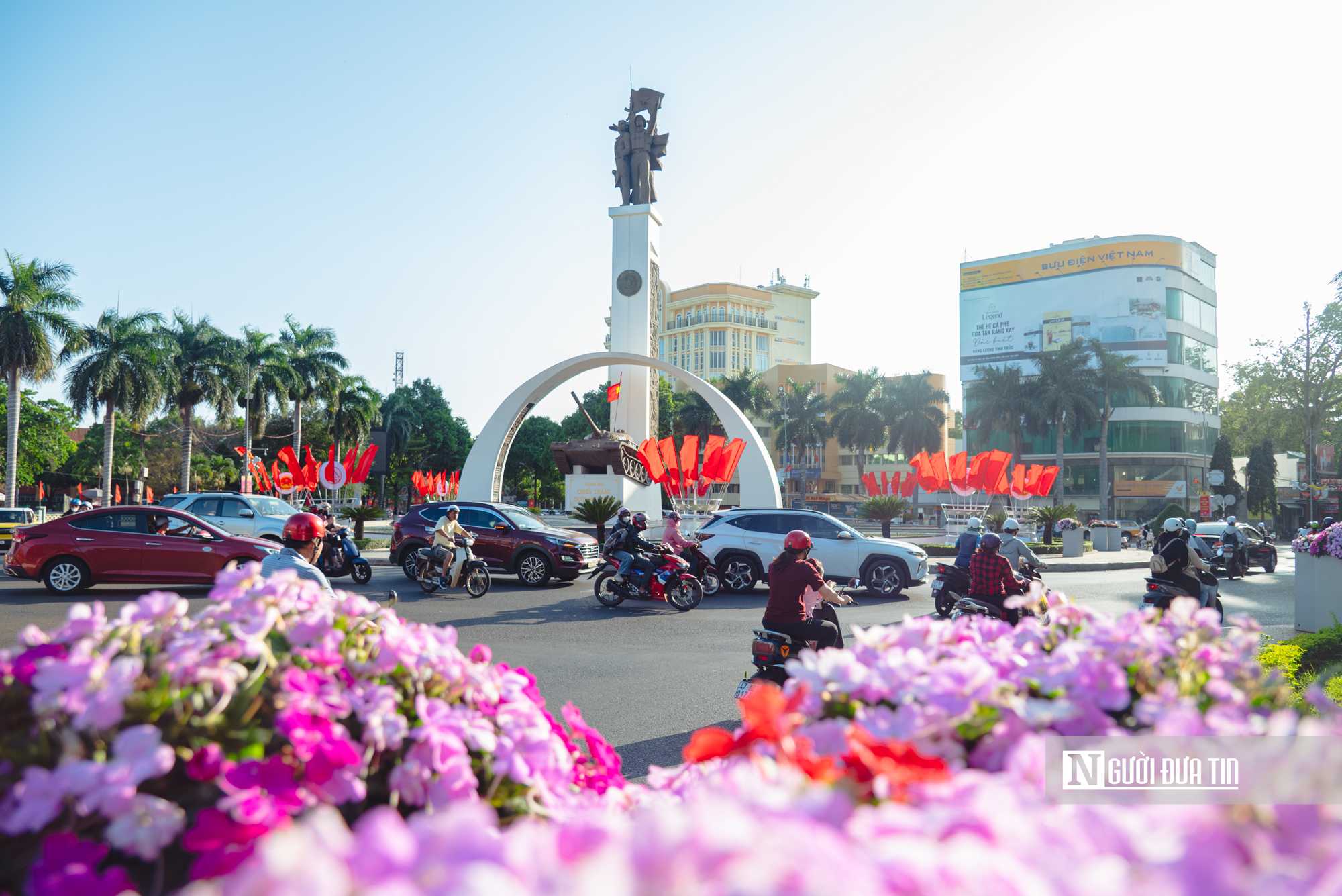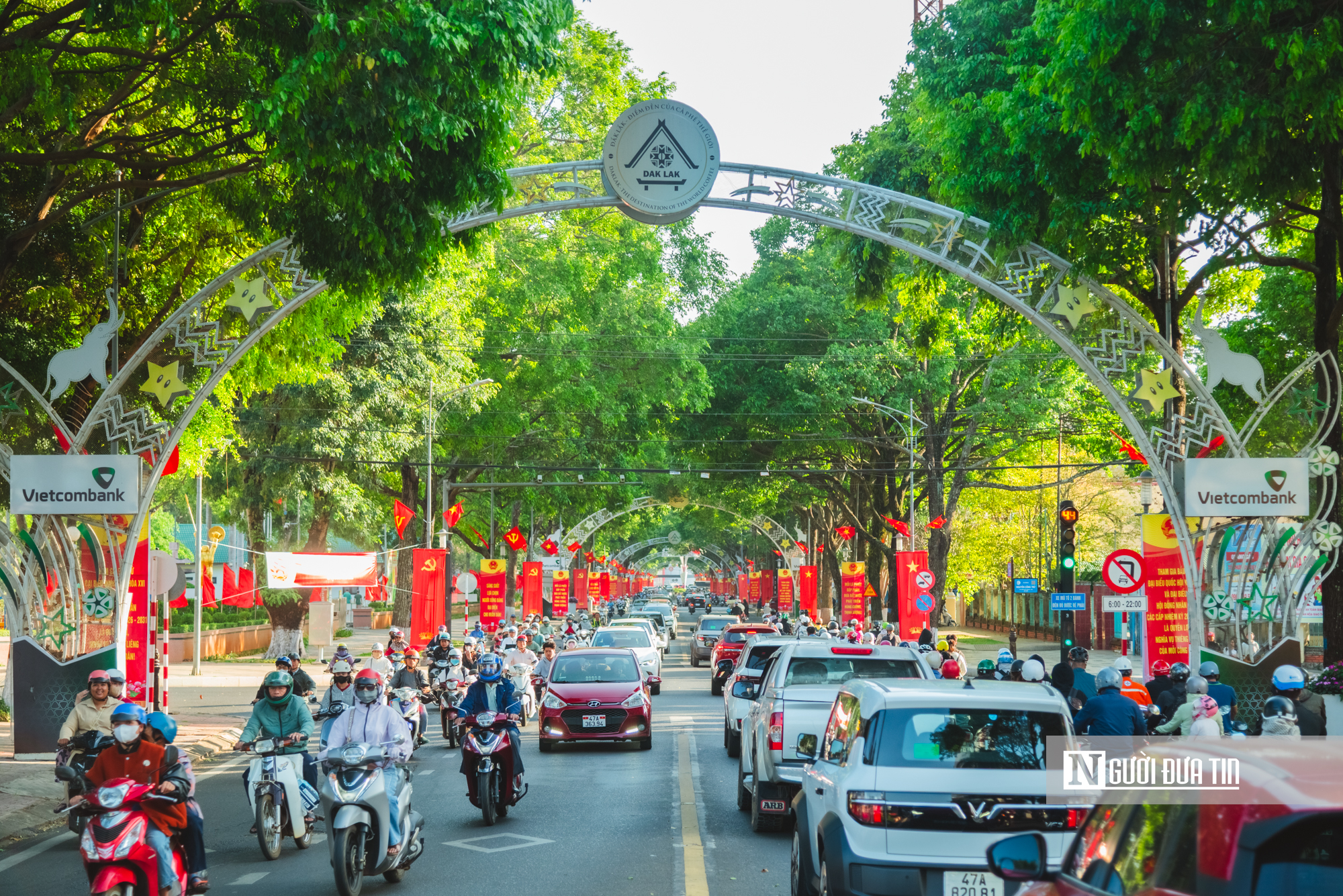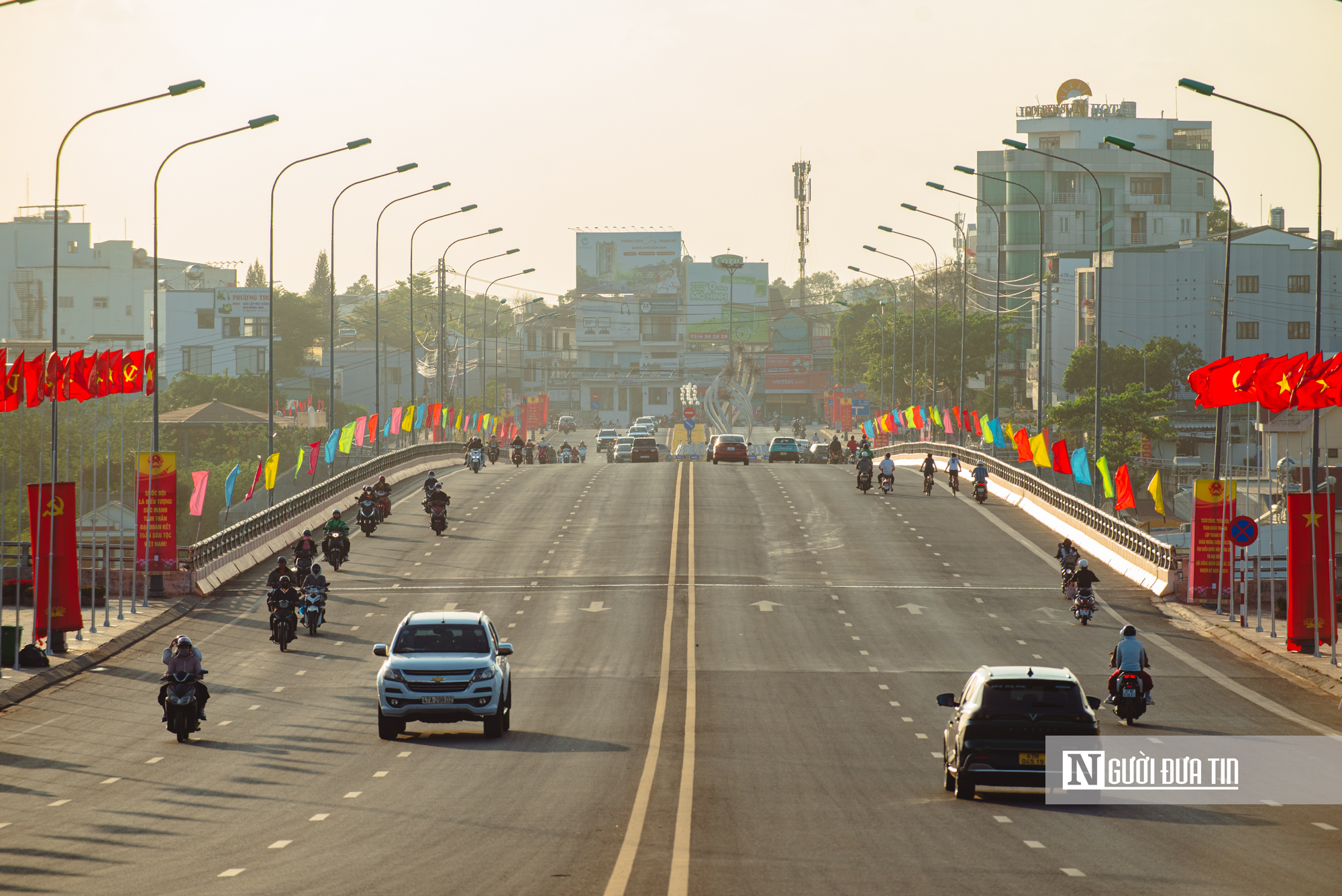 Quốc huy Nước Cộng hòa Xã hội Chủ nghĩa Việt Nam cùng logo nhận diện thương hiệu mới của tỉnh Đắk Lắk cũng được lắp đặt nổi bật trên các tuyến phố.