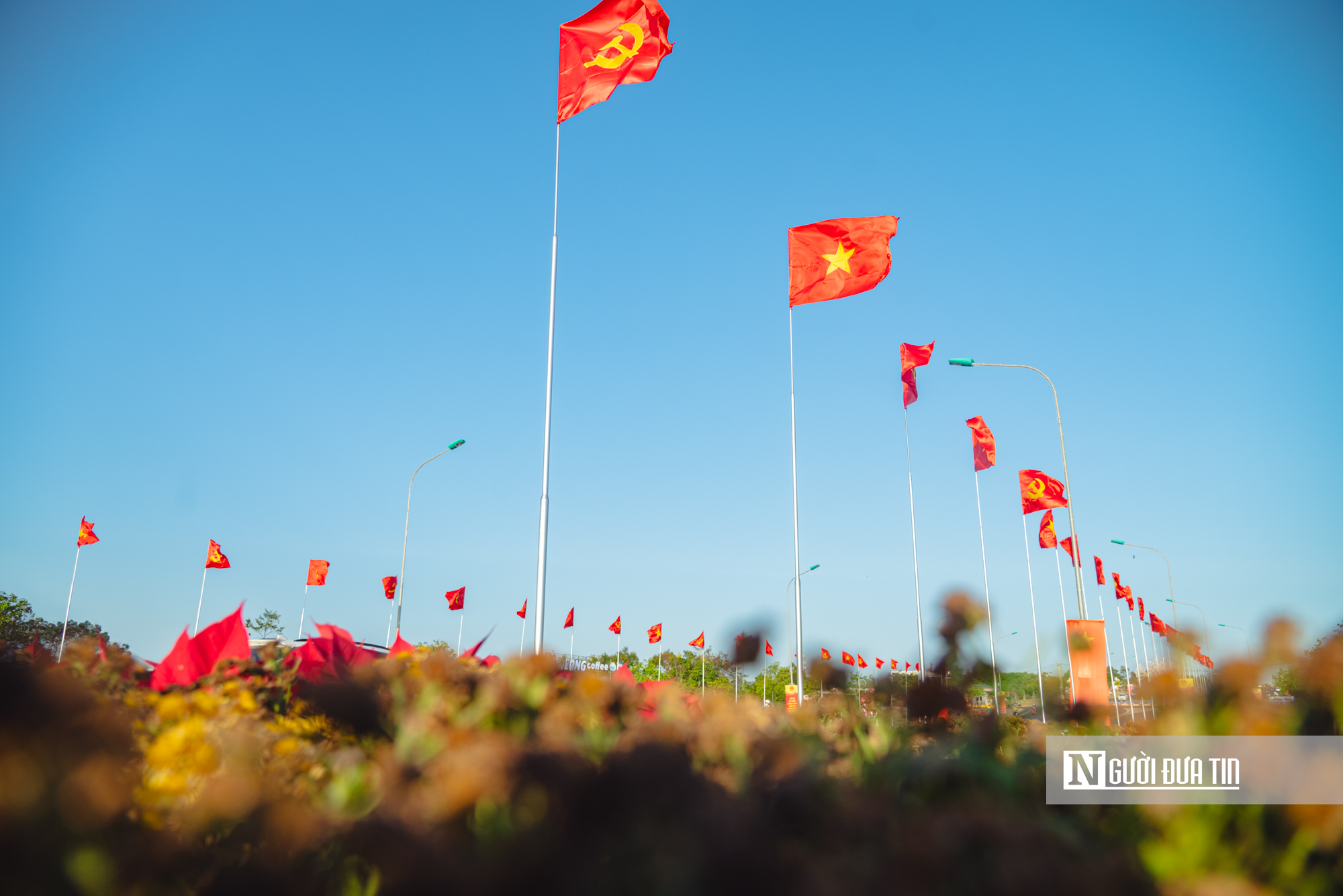 Khu vực Đại lộ Đông – Tây nối từ Sân bay Buôn Ma Thuột về trung tâm thành phố cũng được treo cờ hoa rực rỡ.