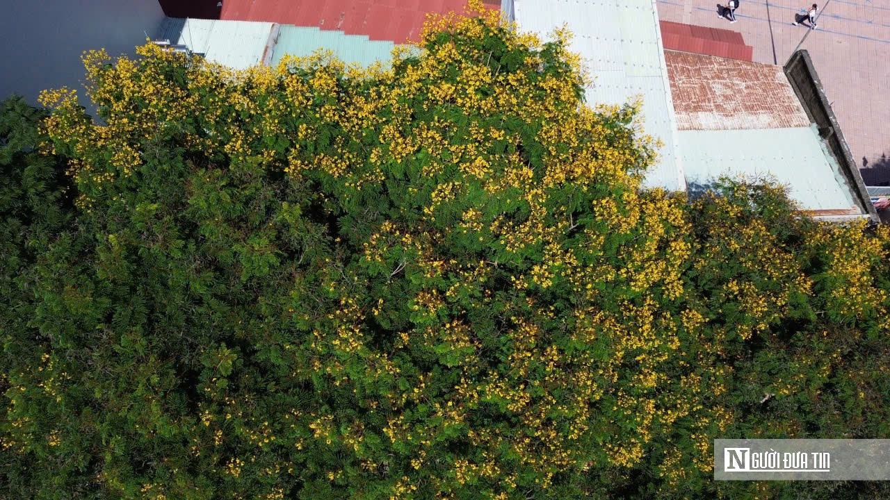 Hình ảnh từ trên cao cho thấy hàng lim xẹt nở vàng rực ngay khu vực cổng trường, tạo nên khung cảnh nổi bật giữa khu dân cư.