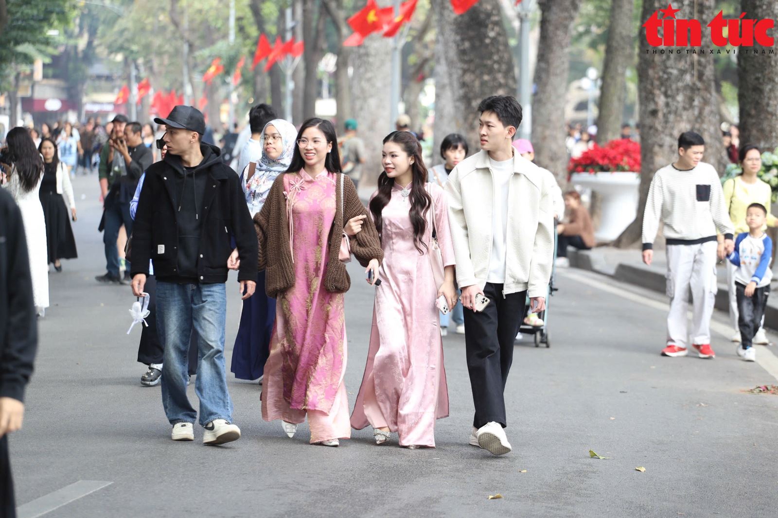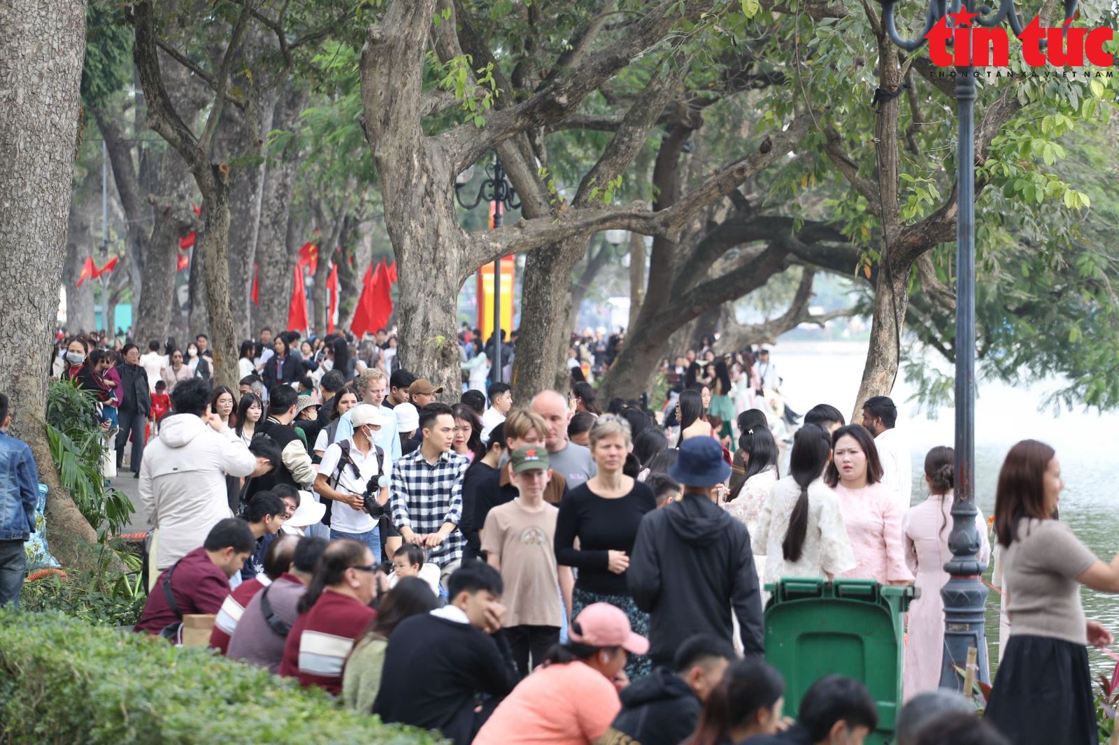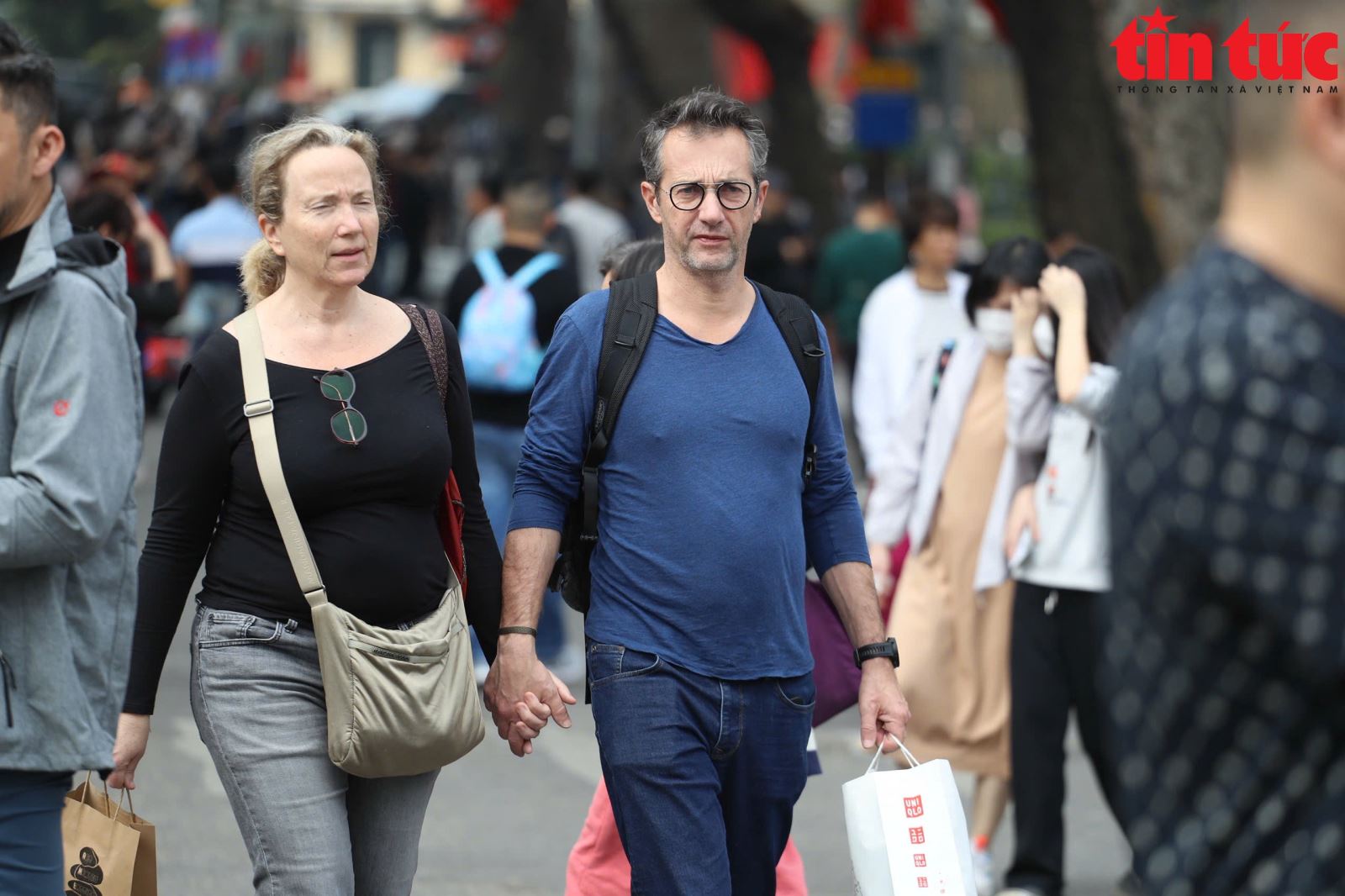 Tại khu vực hồ Hoàn Kiếm, nhiều du khách quốc tế đi bộ quanh hồ, chụp ảnh, quan sát nếp sống của người Hà Nội.