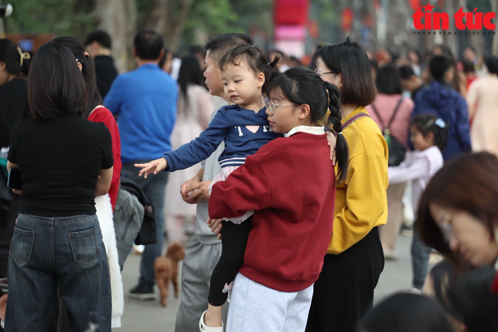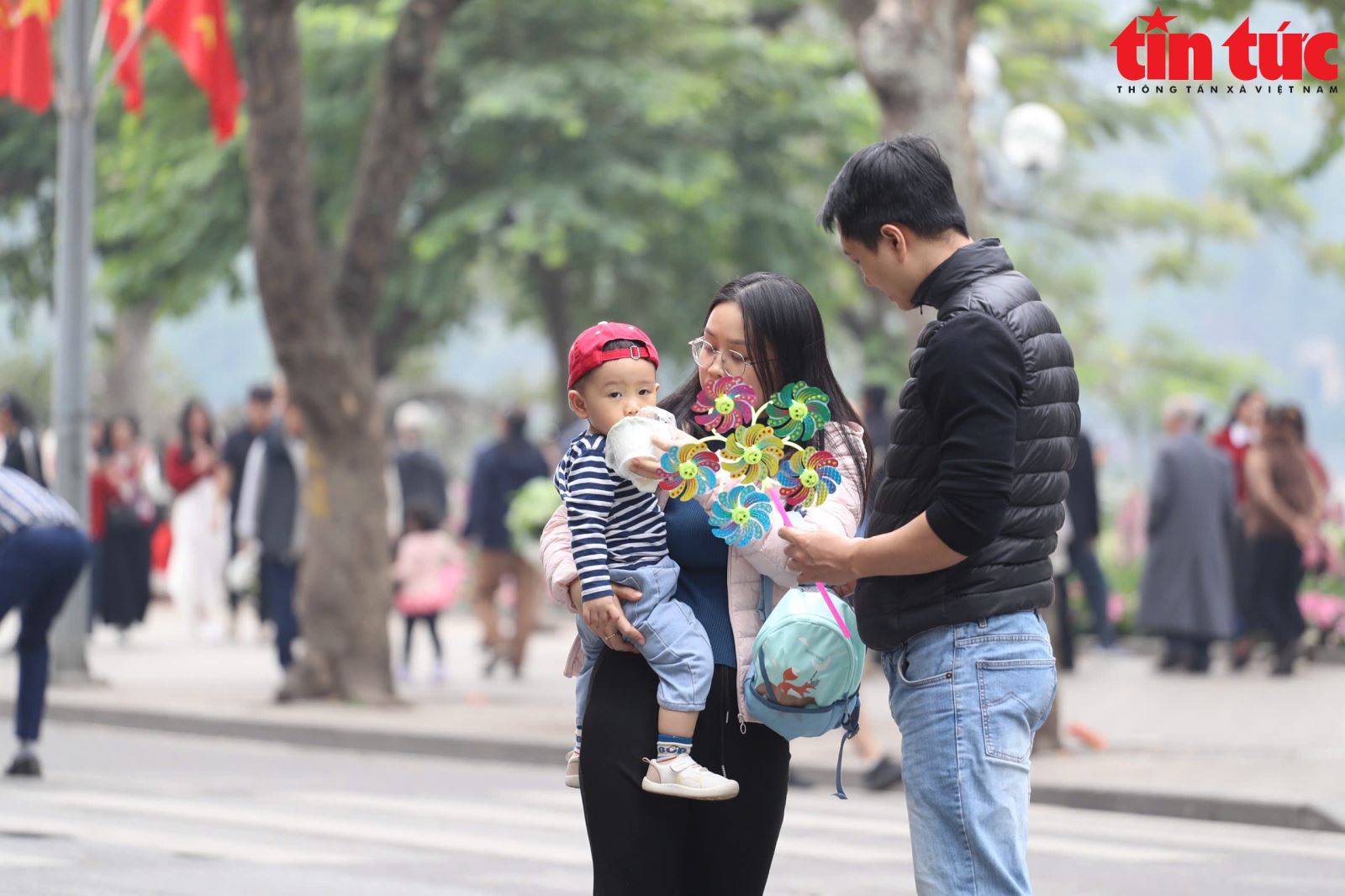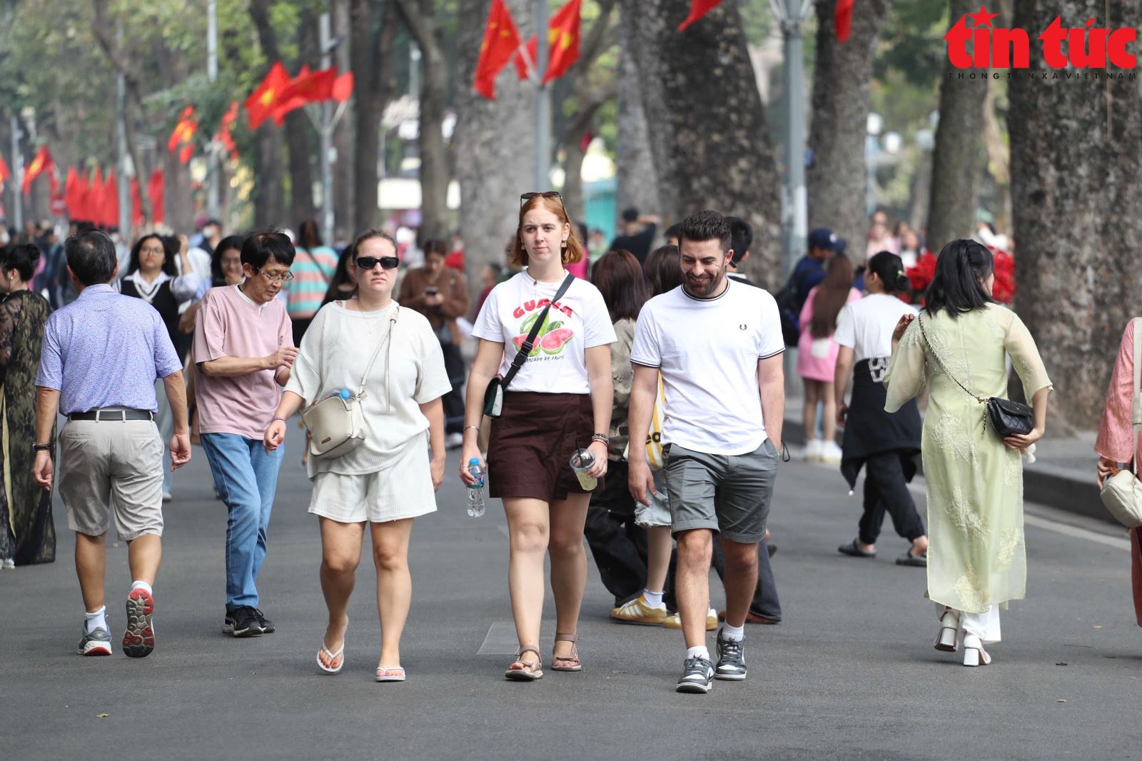 Tại khu vực hồ Hoàn Kiếm, nhiều du khách quốc tế đi bộ quanh hồ, chụp ảnh, quan sát nếp sống của người Hà Nội.