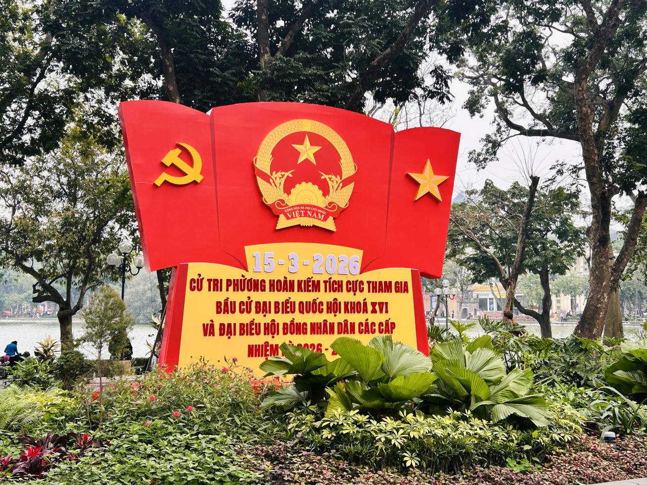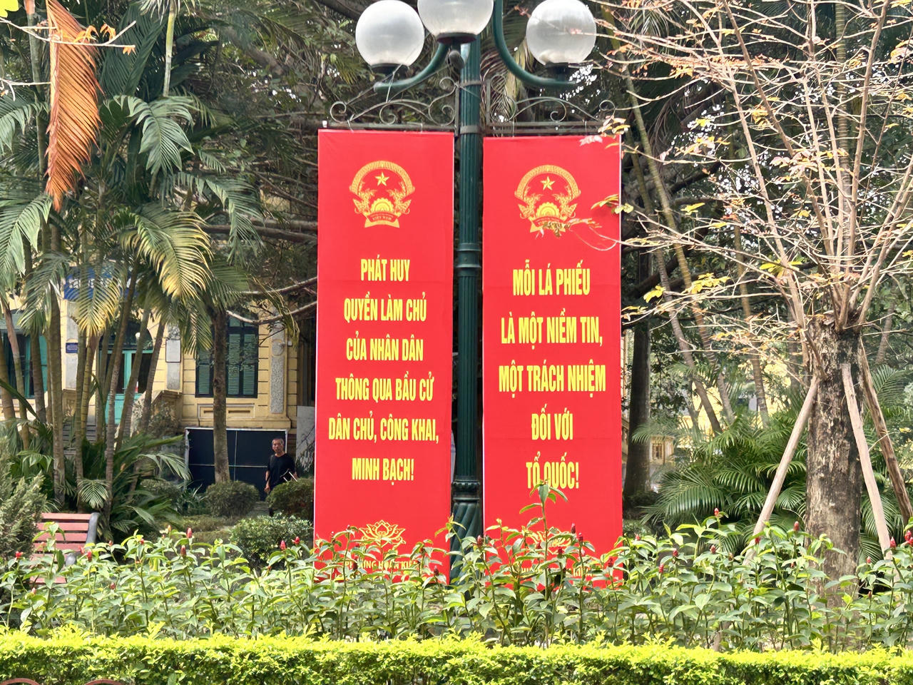 Tại nhiều tuyến phố, vườn hoa, công viên và quảng trường ở Hà Nội, các pano, băng rôn và khẩu hiệu tuyên truyền về ngày bầu cử 15/3 được bố trí nổi bật, góp phần lan tỏa không khí phấn khởi hướng về ngày hội non sông.