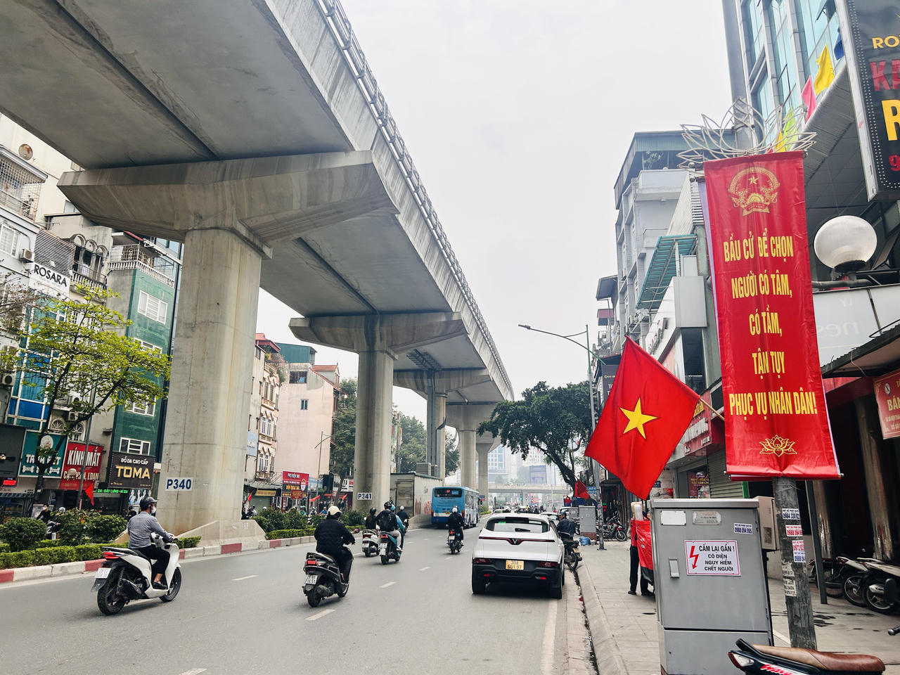 Không gian trên đường Độc Lập trở nên nổi bật với hệ thống pano, băng rôn và khẩu hiệu tuyên truyền về ngày bầu cử, góp phần tạo nên bầu không khí phấn khởi tại khu vực trung tâm Thủ đô.