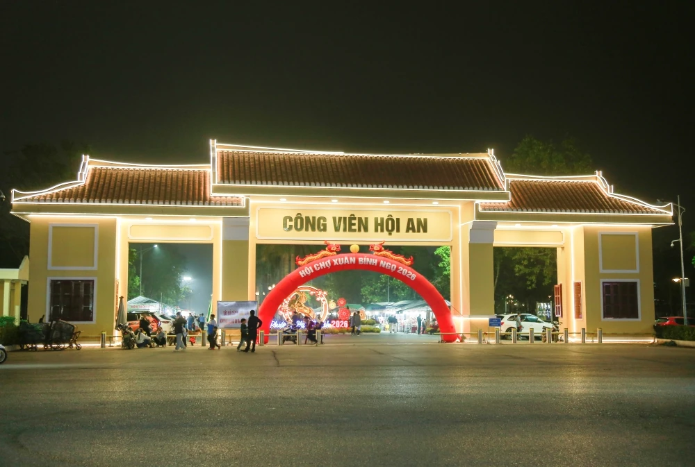 Cổng Công viên Hội An được trang trí bằng đèn vàng ấm áp.