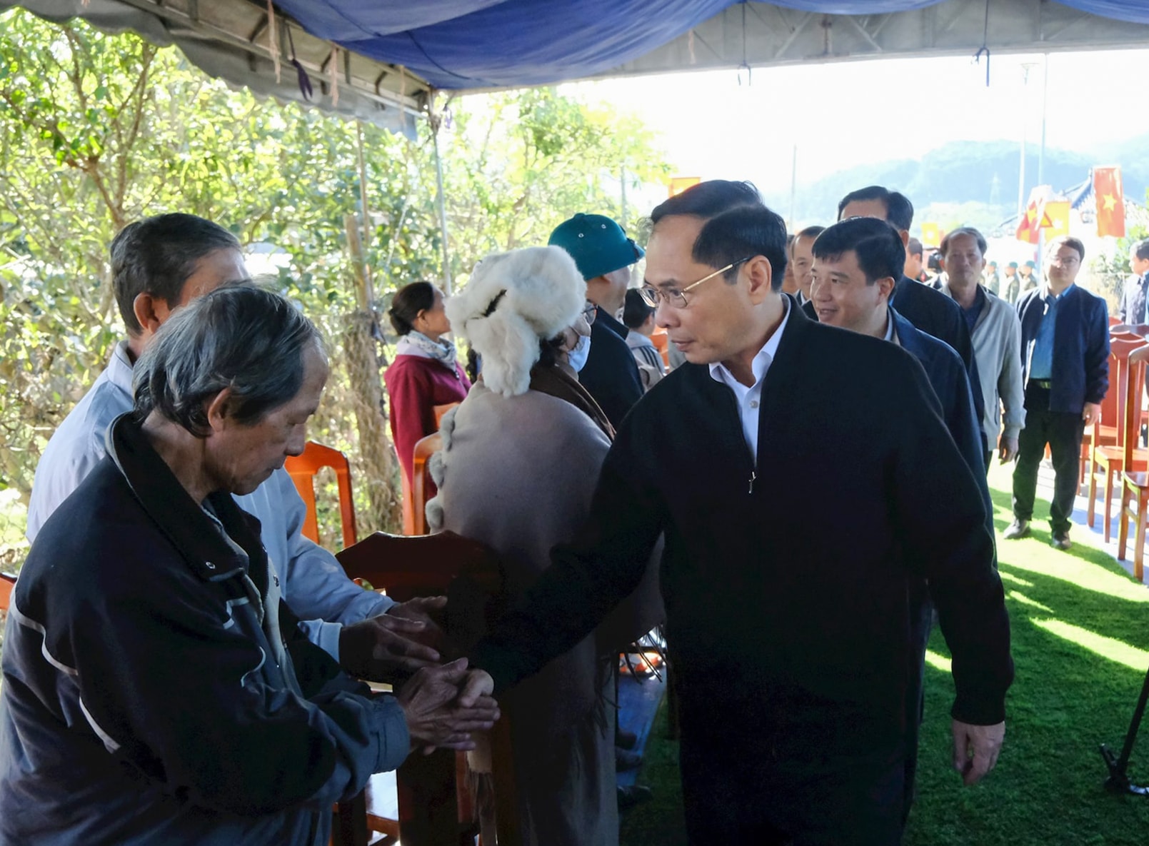 Ủy viên Ban Chấp hành Trung ương Đảng, Phó Thủ tướng Chính phủ Bùi Thanh Sơn tặng quà cho các hộ gia đình bị thiệt hại do bão lũ