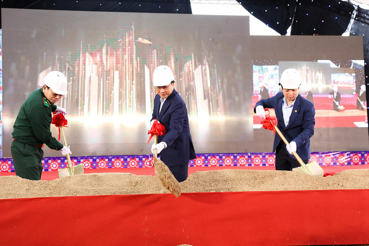 Phó Thủ tướng Bùi Thanh Sơn cùng Chủ tịch UBND tỉnh Cao Bằng Lê Hải Hòa và các đại biểu thực hiện nghi thức động thổ, khởi công xây dựng trường.