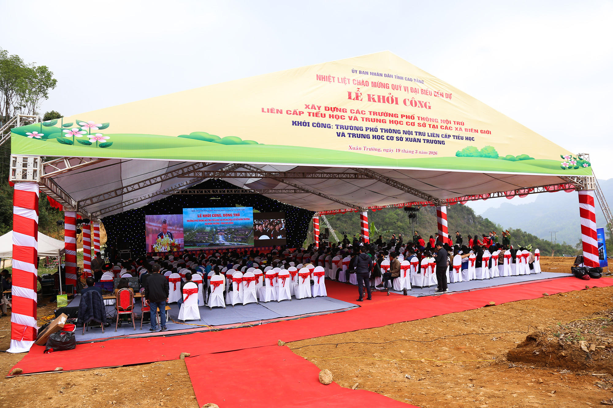 Sáng 19/3, tại vị trí xây dựng Trường Phổ thông Nội trú Tiểu học và Trung học cơ sở Xuân Trường (xã Xuân Trường, Cao Bằng), Phó Thủ tướng Bùi Thanh Sơn và đoàn công tác, lãnh đạo tỉnh Cao Bằng cùng đông đảo bà con nhân dân đã đến dự cùng với các điểm cầu khởi công, xây dựng 121 điểm trường tại 121 xã biên giới trên cả nước.
