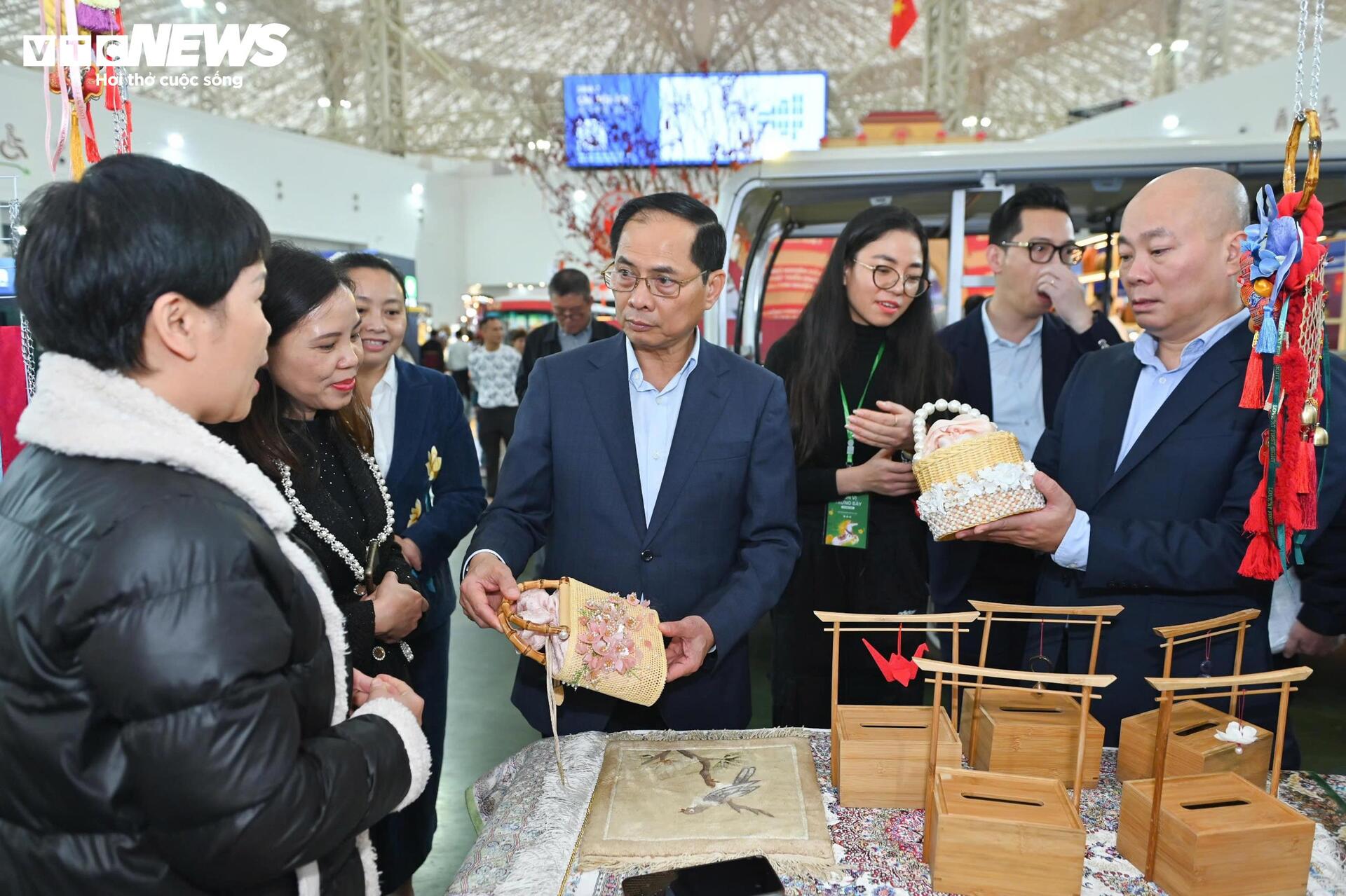 Phó Thủ tướng Bùi Thanh Sơn trực tiếp đi thăm các khu trưng bày, gian hàng của doanh nghiệp, hợp tác xã và tiểu thương đến từ nhiều tỉnh, thành phố trên cả nước.