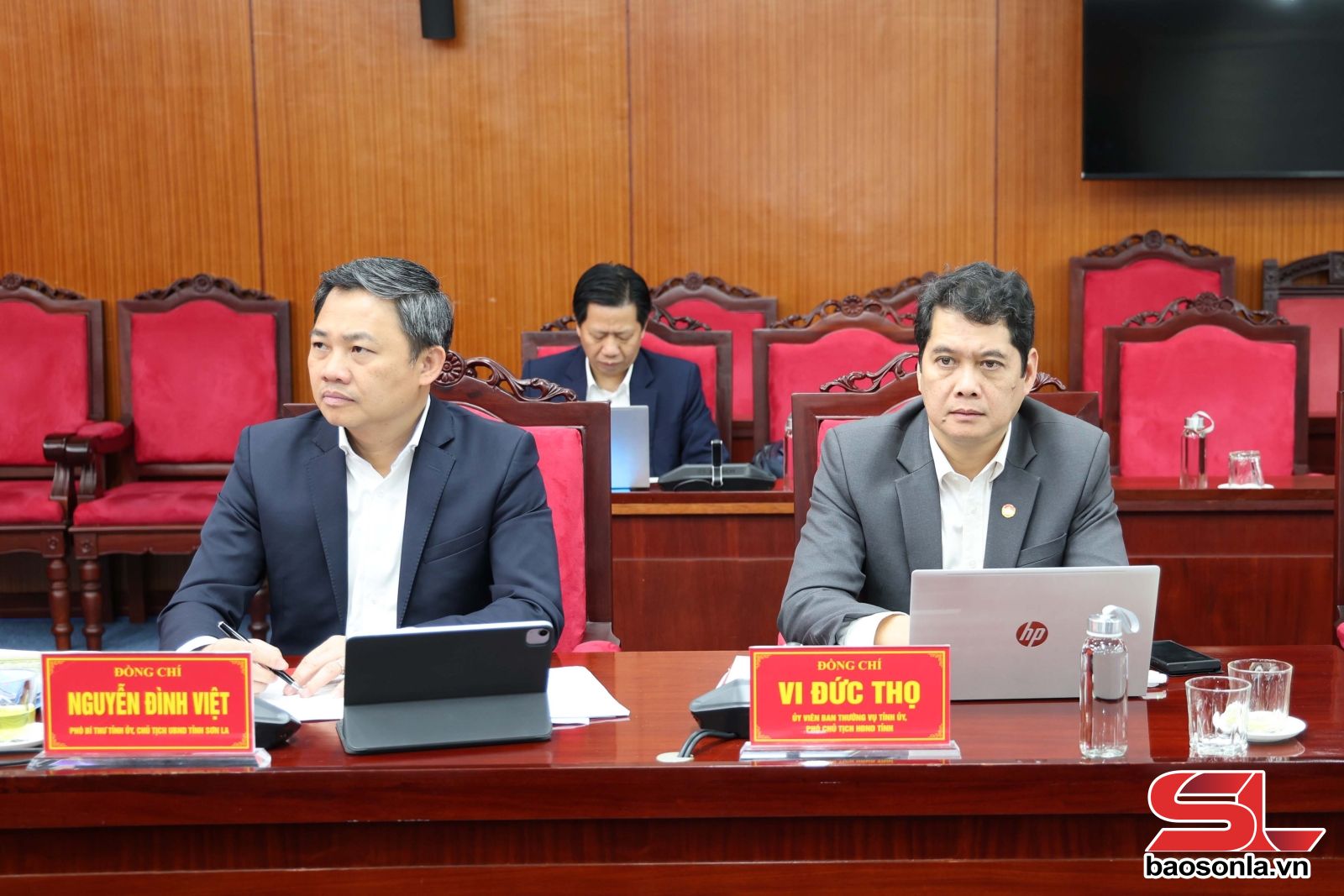 Tiếp và làm việc với Đoàn công tác, tỉnh Sơn La có các đồng chí: Hoàng Văn Nghiệm, Bí thư Tỉnh ủy, Trưởng Đoàn đại biểu Quốc hội tỉnh; Nguyễn Đình Việt, Phó Bí thư Tỉnh ủy, Chủ tịch UBND tỉnh; các đồng chí Ủy viên Ban Thường vụ Tỉnh ủy; lãnh đạo UBND tỉnh; đại diện các sở, ban, ngành của tỉnh.