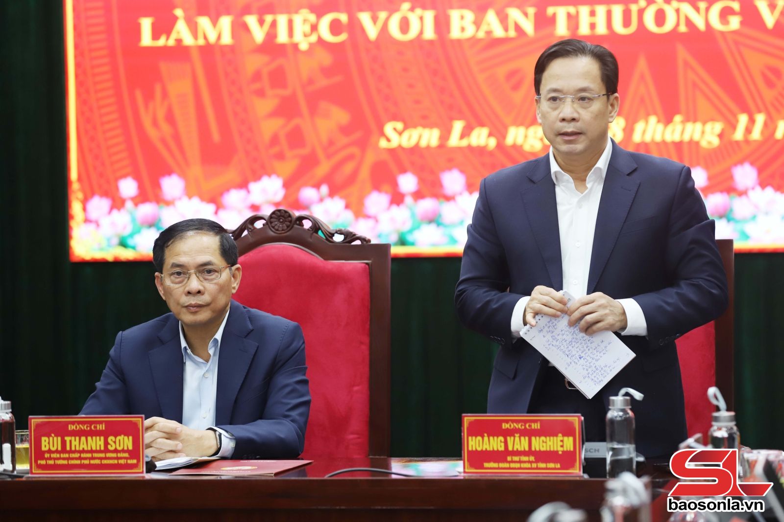 Thay mặt Ban Thường vụ Tỉnh ủy Sơn La, đồng chí Hoàng Văn Nghiệm, Bí thư Tỉnh ủy trân trọng cảm ơn Phó Thủ tướng Chính phủ Bùi Thanh Sơn và Đoàn công tác đã quan tâm, giành thời gian trực tiếp nắm bắt tình hình, chỉ đạo, hỗ trợ tháo gỡ khó khăn trong việc triển khai các nhiệm vụ phát triển kinh tế - xã hội.