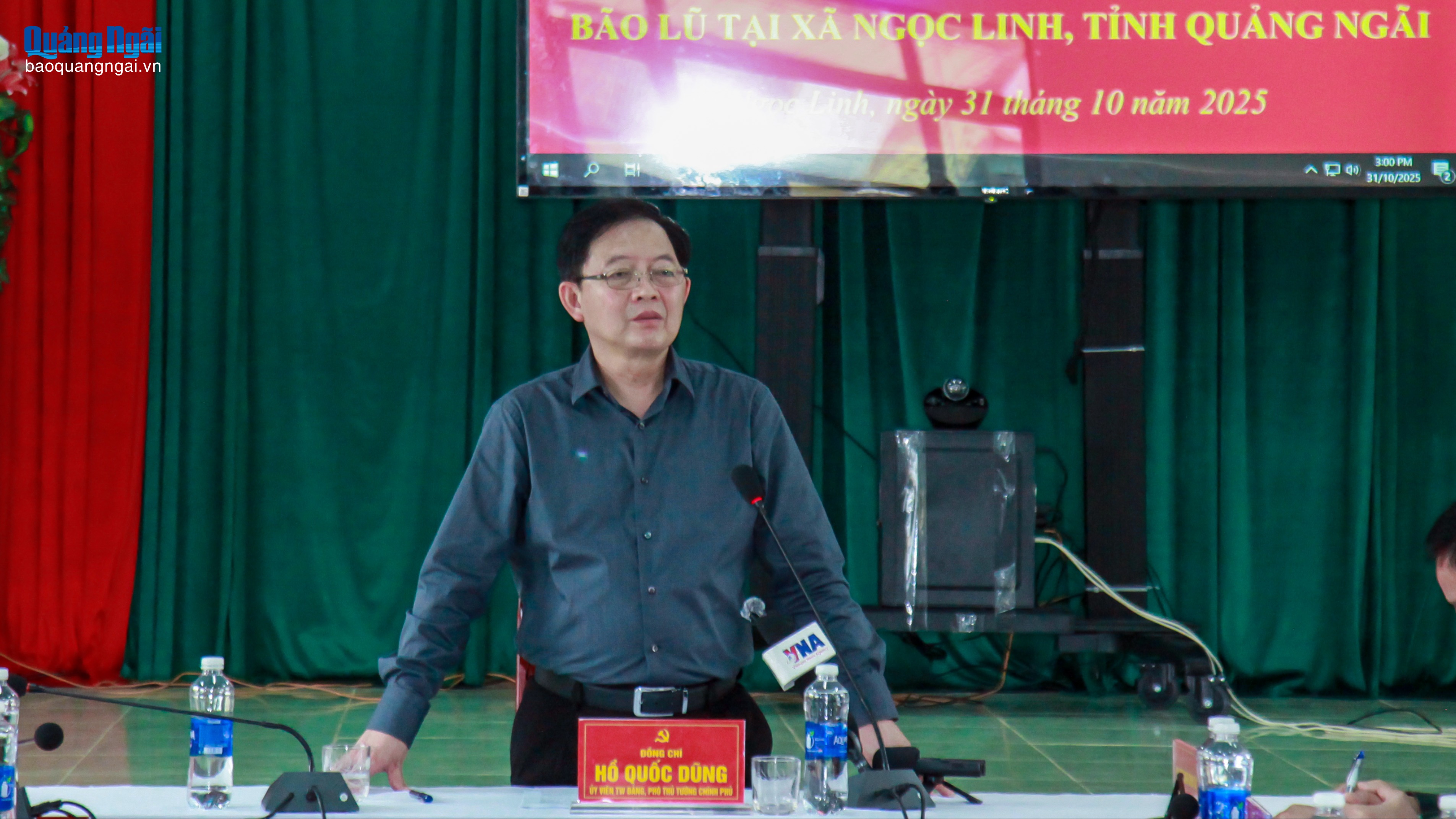 Chiều 31/10, Ủy viên Trung ương Đảng, Phó Thủ tướng Chính phủ Hồ Quốc Dũng trực tiếp đến xã Ngọc Linh kiểm tra tình hình sạt lở nghiêm trọng do mưa lớn sau bão số 12, chỉ đạo triển khai các giải pháp khẩn cấp nhằm đảm bảo an toàn và hỗ trợ người dân vùng bị cô lập.
