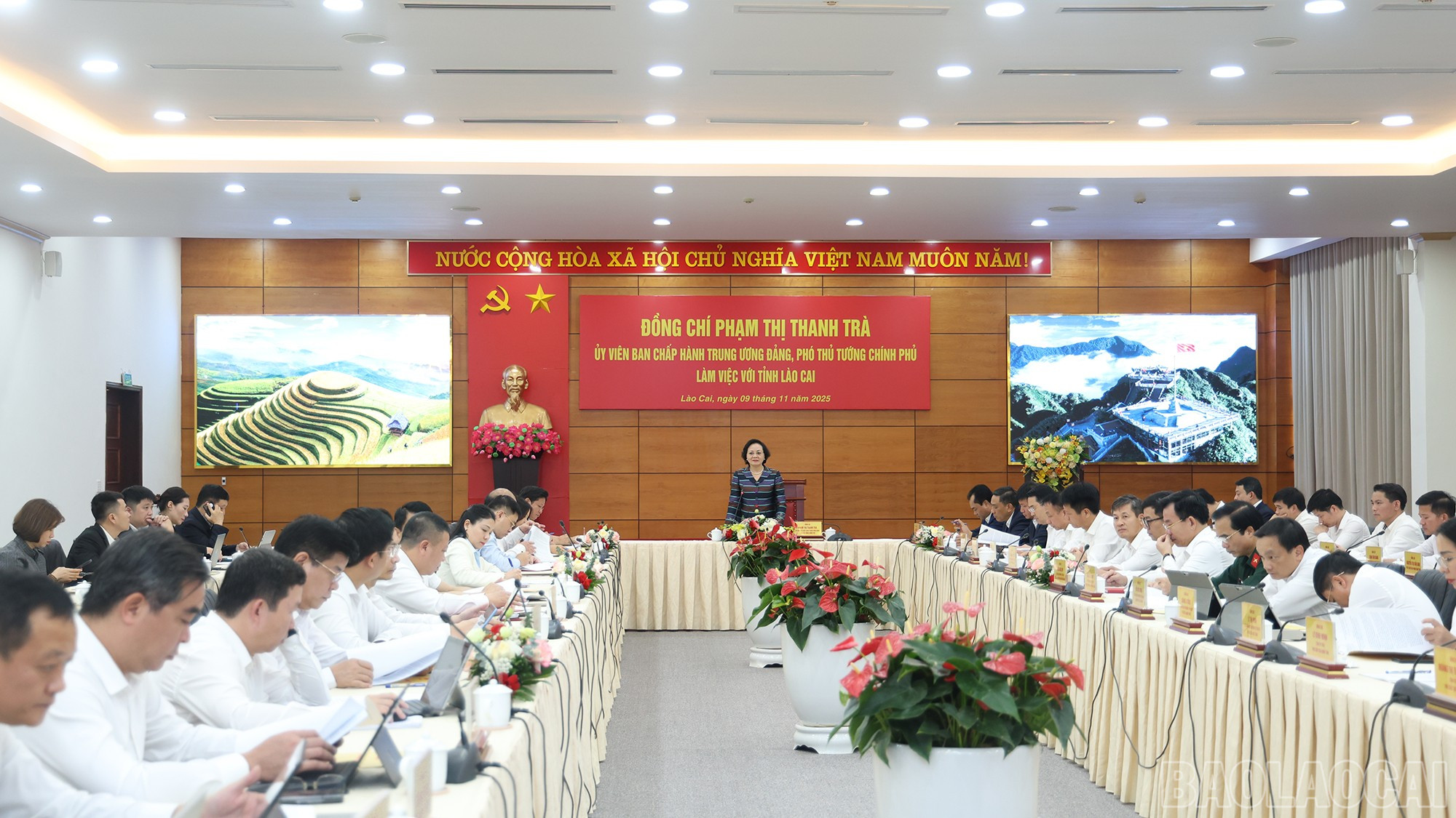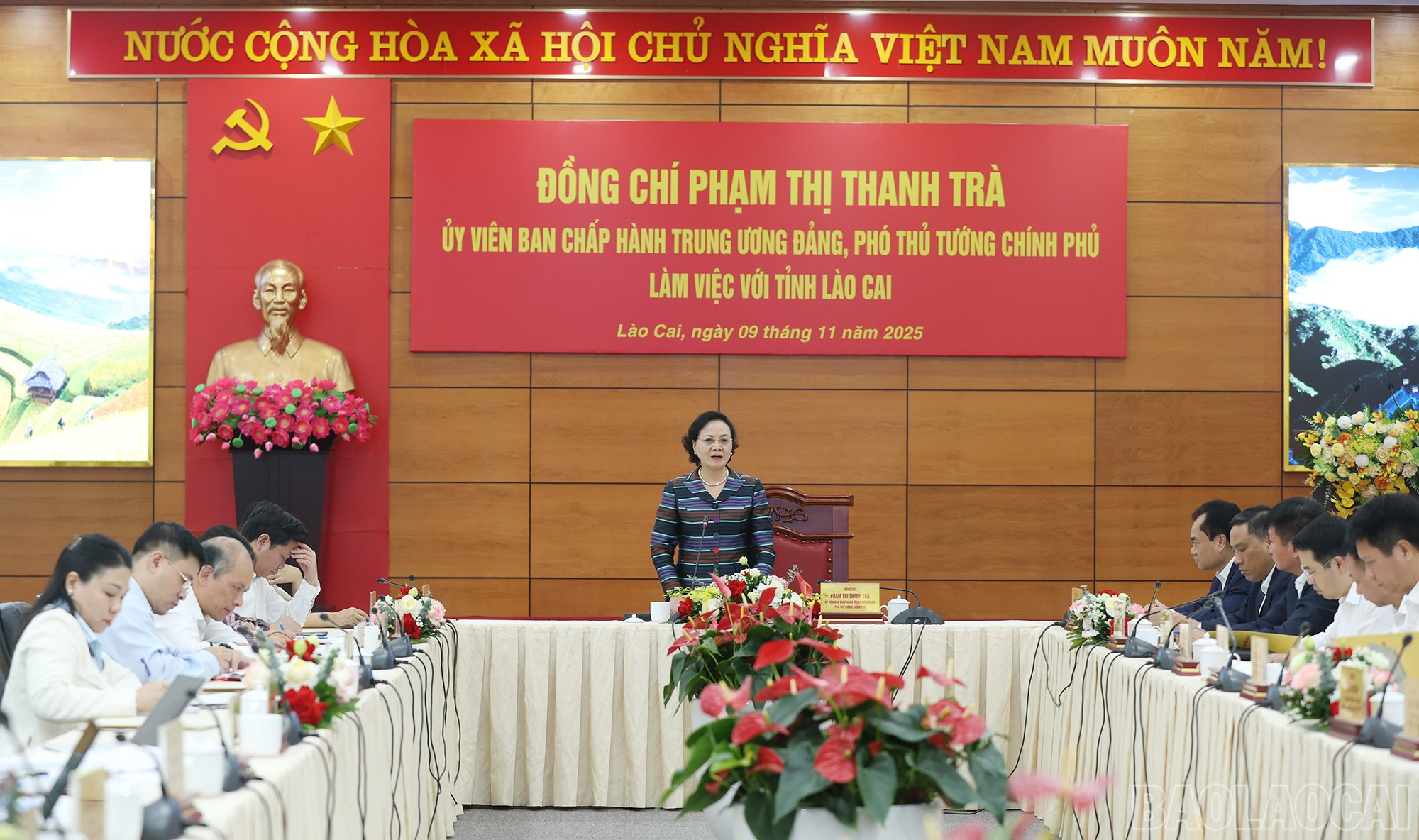 Phát biểu kết luận buổi làm việc, đồng chí Phạm Thị Thanh Trà - Ủy viên Ban Chấp hành Trung ương Đảng, Phó Thủ tướng Chính phủ đánh giá cao những kết quả đạt được của tỉnh Lào Cai trên mọi lĩnh vực trong 10 tháng năm 2025, nổi bật là việc phát triển kinh tế; sắp xếp, tinh gọn bộ máy, vận hành mô hình chính quyền địa phương 2 cấp; chuẩn bị và tổ chức thành công Đại hội Đảng bộ tỉnh lần thứ I; quan tâm khắc phục hậu quả thiên tai, những vấn đề văn hóa, an sinh xã hội, phúc lợi xã hội…; vận hành chính quyền địa phương 2 cấp đạt nhiều kết quả phấn khởi, cơ bản ổn định.
