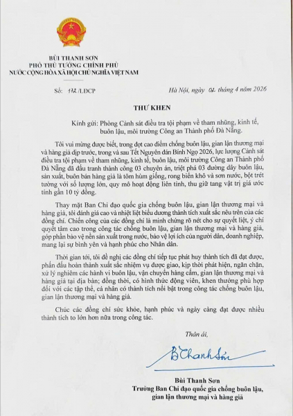 Thư khen ngợi của Phó Thủ tướng Chính phủ Bùi Thanh Sơn, Trưởng Ban Chỉ đạo quốc gia chống buôn lậu, gian lận thương mại và hàng giả đến Phòng Cảnh sát kinh tế Công an TP Đà Nẵng.