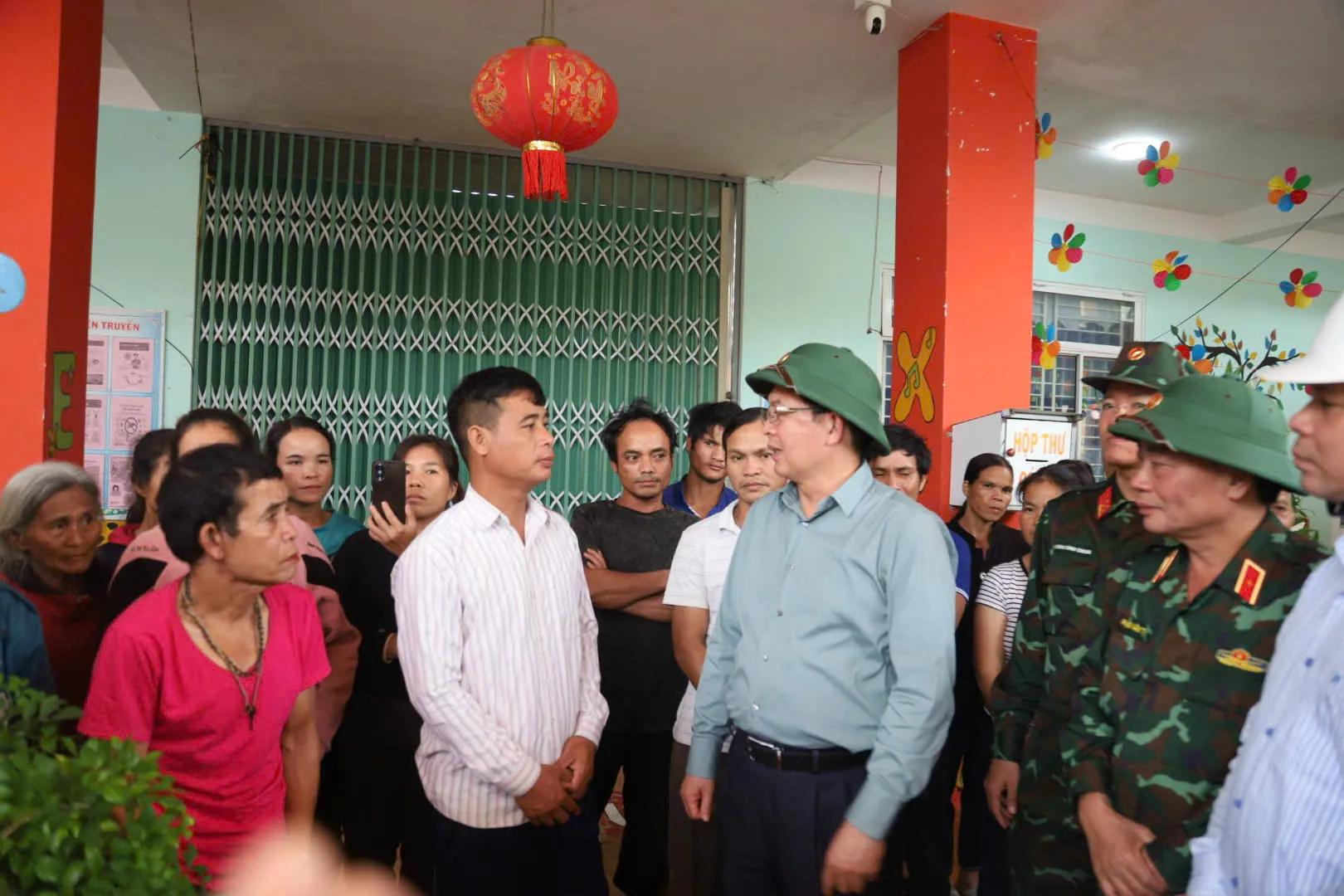 Tại điểm sơ tán Trường Mầm non số 1 Hương Trà, tổ 1 thôn Trà Linh, xã Tây Trà Bồng, Phó Thủ tướng Hồ Quốc Dũng ân cần thăm hỏi, chia sẻ khó khăn với người dân và yêu cầu chính quyền các cấp chăm lo tốt đời sống, đảm bảo đủ nhu yếu phẩm, nước sạch và chỗ ở an toàn.