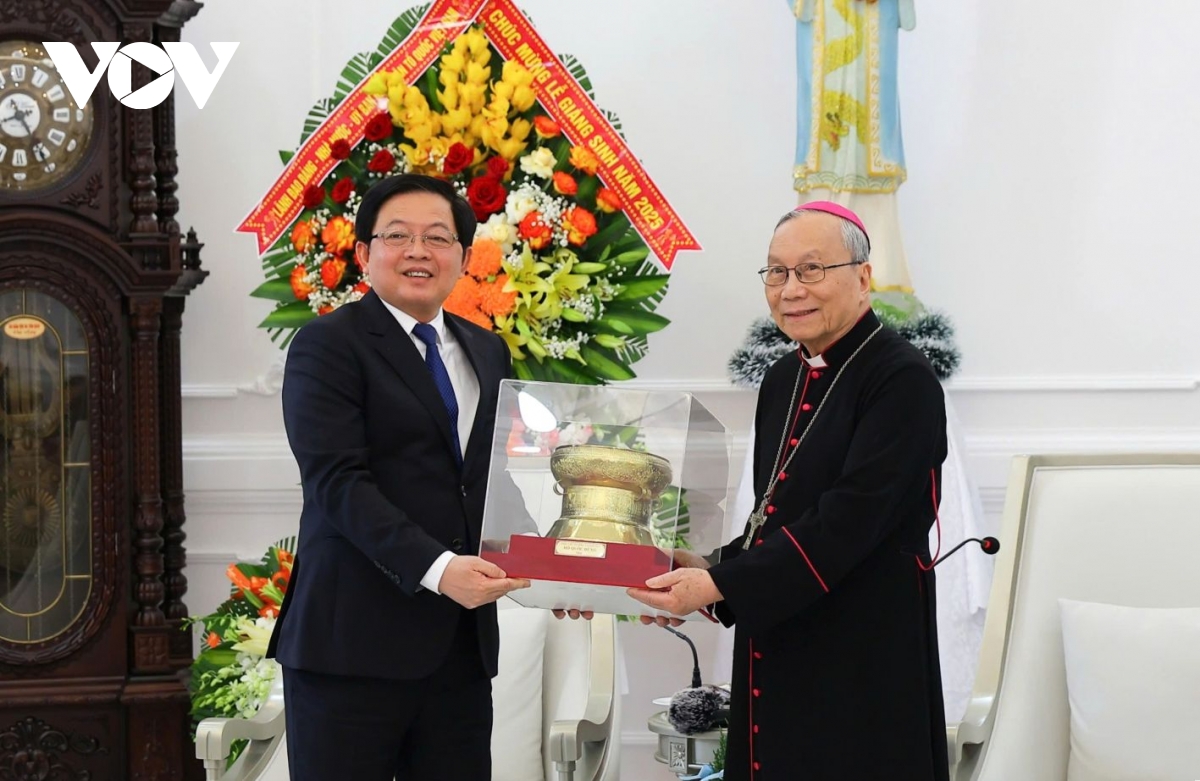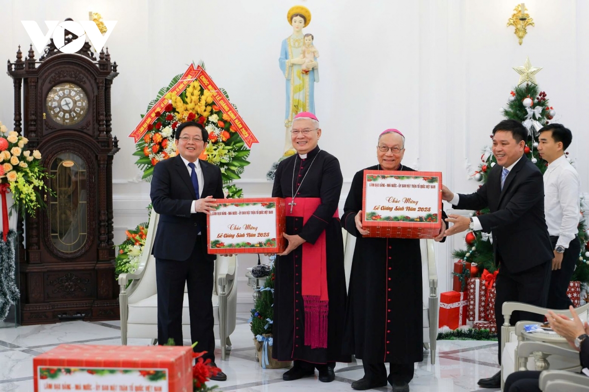 Phó Thủ tướng Hồ Quốc Dũng (ngoài cùng bên trái) trao quà tặng Đức Tổng Giám mục Đặng Đức Ngân và các vị chức sắc Công giáo nhân dịp Giáng sinh năm 2025