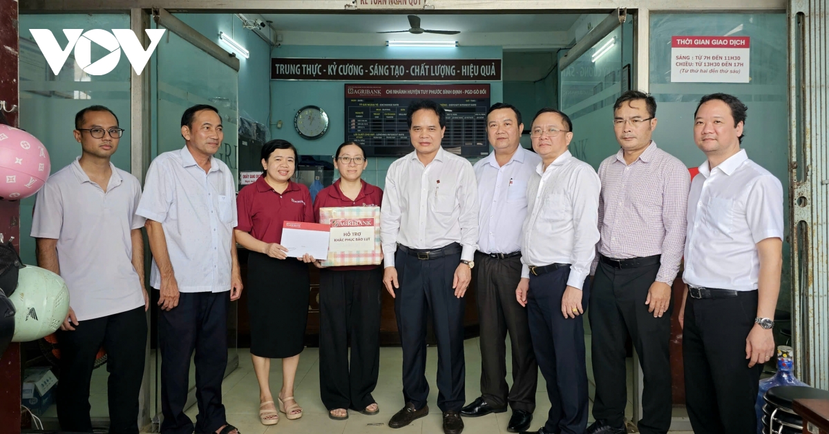 Lãnh đạo Agribank cũng đến thăm, tặng quà những cán bộ và gia đình cán bộ nhân viên Phòng Giao dịch Gò Bồi - Tuy Phước - Bình Định bị thiệt hại do bão số 13.