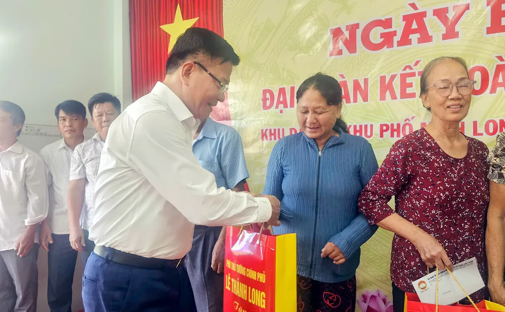 Dịp này, Phó Thủ tướng Lê Thành Long đã tặng 10 phần quà cho các hộ có hoàn cảnh khó khăn trên địa bàn khu phố Minh Long.