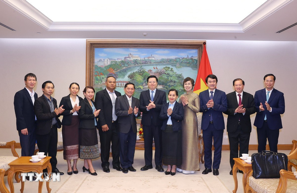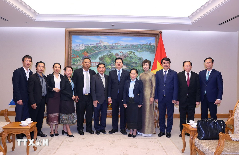 Phó Thủ tướng Mai Văn Chính với các thành viên đoàn Thông tấn xã Pathet Lào. (Ảnh: Văn Điệp/TTXVN)