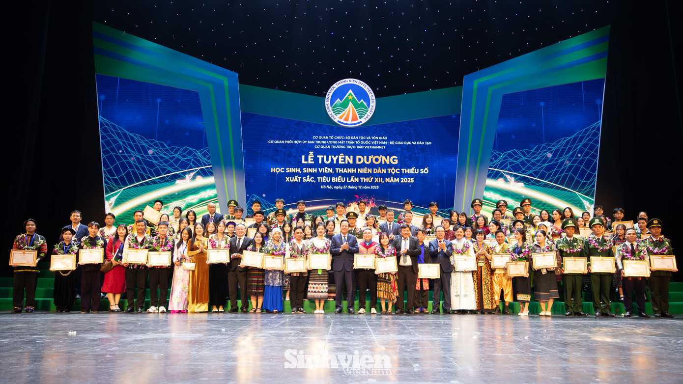 Bộ trưởng Bộ Dân tộc và Tôn giáo Đào Ngọc Dung và các lãnh đạo chụp ảnh lưu niệm cùng 150 học sinh, sinh viên, thanh niên DTTS xuất sắc, tiêu biểu năm 2025. Năm nay, chương trình vinh danh 150 gương mặt ưu tú thuộc 53 dân tộc đến từ khắp các tỉnh, thành. Trong đó có nhiều em đã giành giải cao trong các kỳ thi học sinh giỏi quốc gia, cuộc thi khoa học kỹ thuật và các đấu trường thể thao khu vực, quốc tế. Những thành tích này không chỉ lan tỏa cảm hứng vượt khó, phát triển bản thân mà còn góp phần khẳng định trí tuệ, bản lĩnh và tiềm năng to lớn của thế hệ trẻ người dân tộc thiểu số Việt Nam trong kỷ nguyên mới.