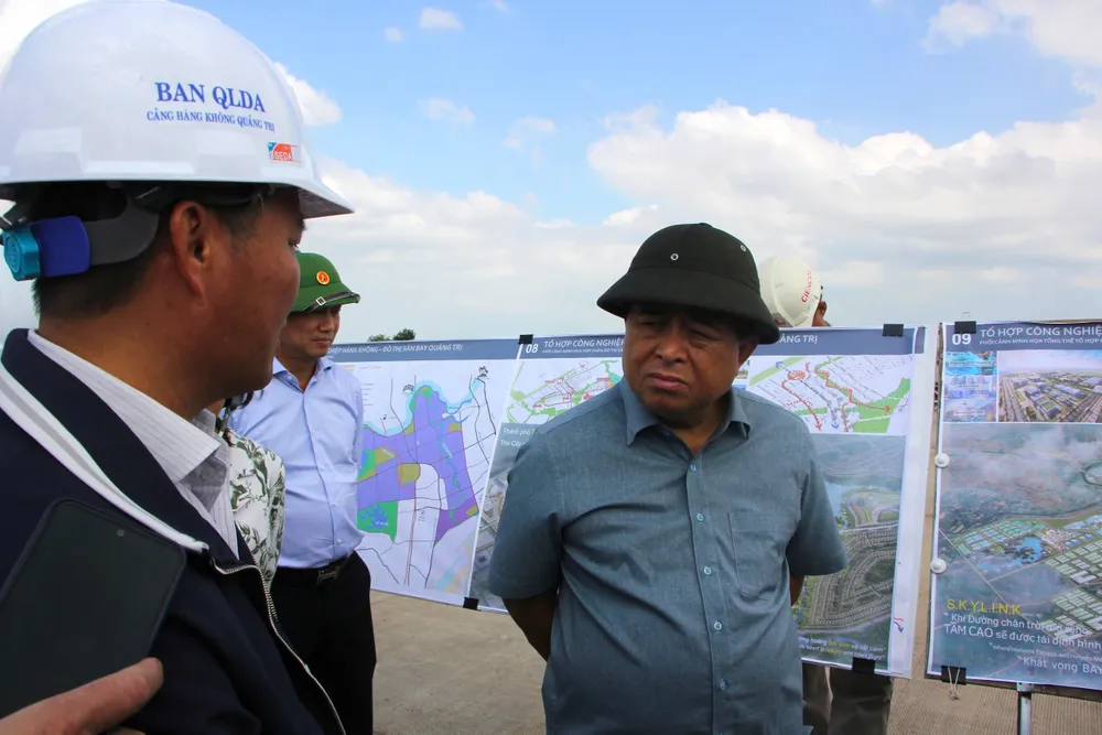 Tại dự án Cảng hàng không Quảng Trị (xã Gio Linh), Phó Thủ tướng Chính phủ Nguyễn Chí Dũng kiểm tra tiến độ thi công và động viên cán bộ, công nhân trên công trường.