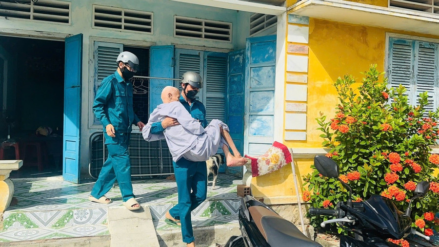 Xã Tuy Phước Đông hỗ trợ người cao tuổi đi lại khó khăn đến nơi tránh trú an toàn trước khi bão số 13 đổ bộ. Ảnh: ĐVCC