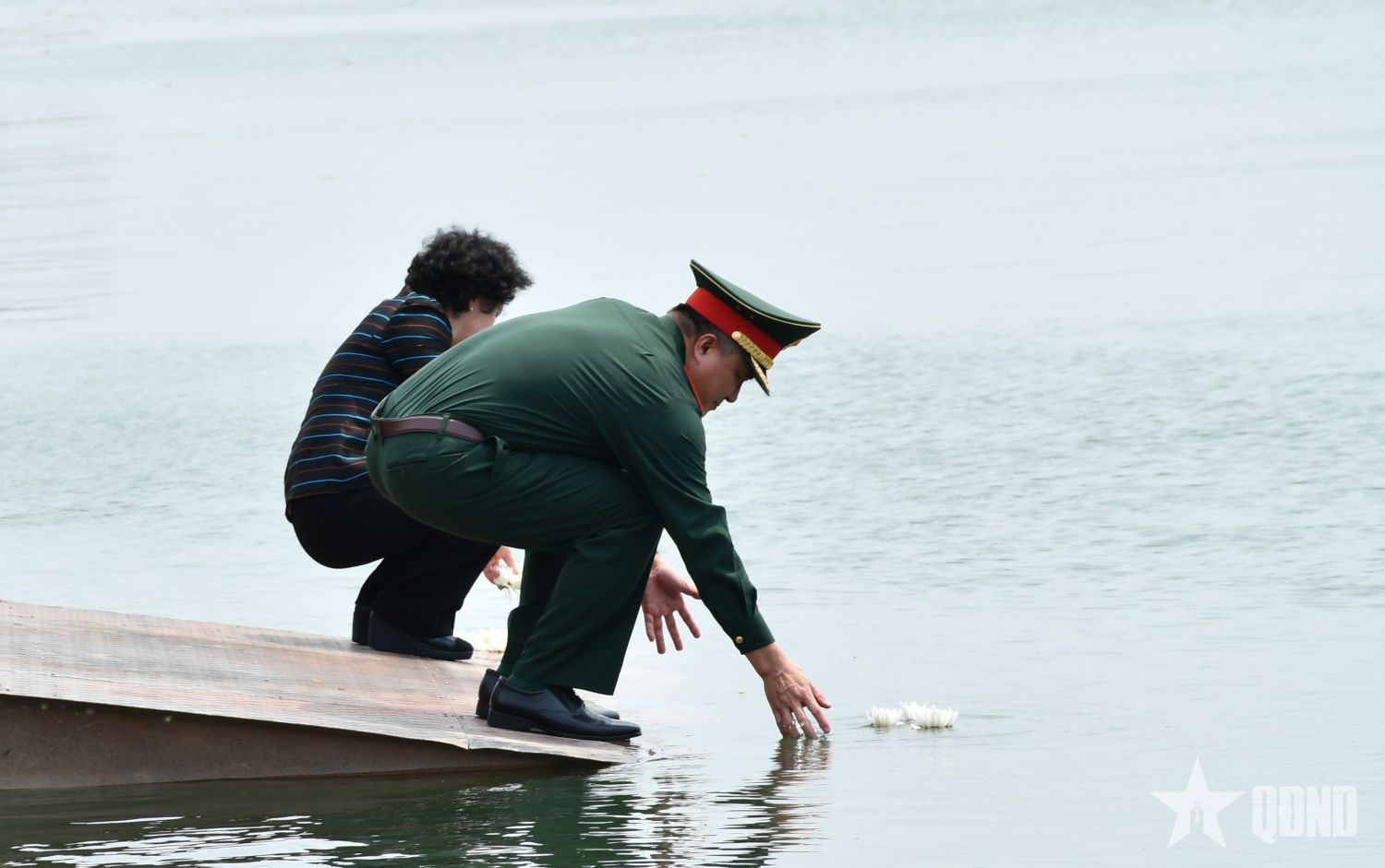 Các đại biểu thả hoa tưởng niệm các Anh hùng liệt sĩ tại bến thả hoa trên dòng sông Long Đại.