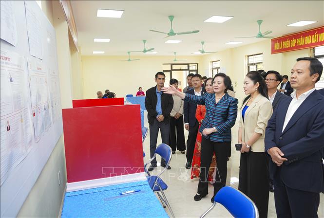 Phó Thủ tướng Phạm Thị Thanh Trà kiểm tra khu vực dành cho cử tri viết phiếu bầu tại Khu vực bỏ phiếu số 12 của phường Mường Thanh, tỉnh Điện Biên. Ảnh: Xuân Tư/TTXVN