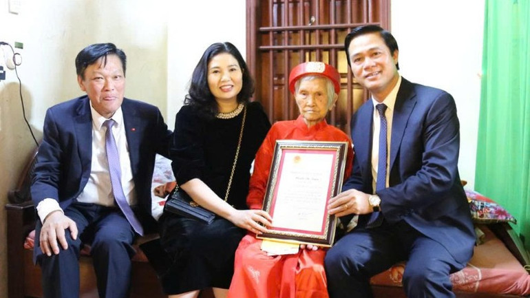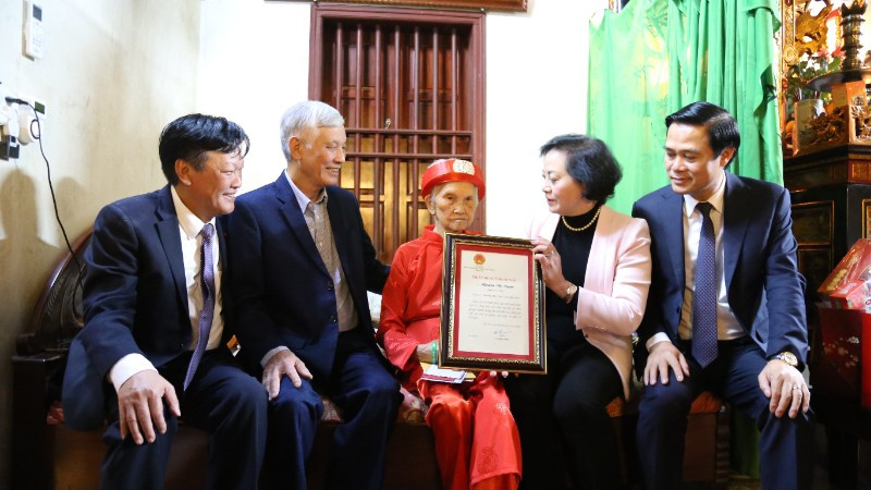Phó Thủ tướng Phạm Thị Thanh Trà trao Thiếp mừng thọ 100 tuổi của Chủ tịch nước tặng cụ Nguyễn Thị Tuyến.