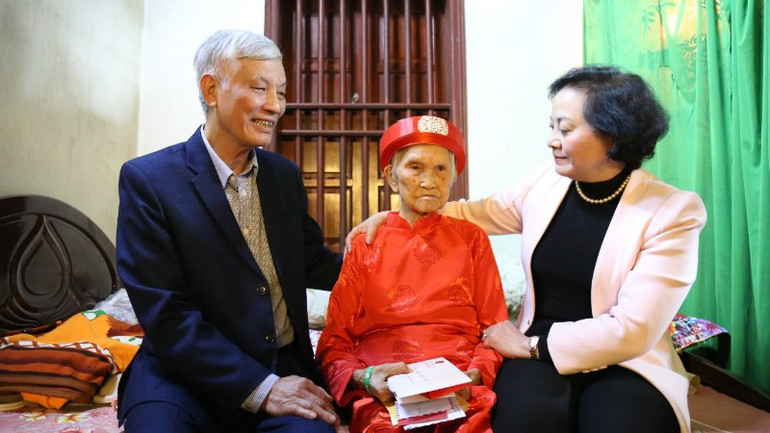 Ân cần thăm hỏi sức khỏe, trân trọng trao quà của Chủ tịch nước cùng nhiều phần quà ý nghĩa tặng cụ Nguyễn Thị Tuyến, Phó Thủ tướng Phạm Thị Thanh Trà chúc cụ dồi dào sức khỏe, trường thọ, tiếp tục là chỗ dựa tinh thần vững chắc cho gia đình, dòng họ và xã hội.
