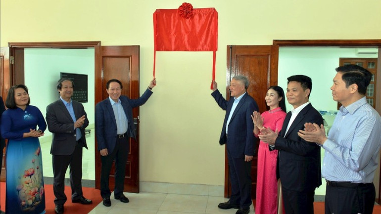Phó Thủ tướng Thường trực Chính phủ Nguyễn Hòa Bình tặng Trường trung học phổ thông Kiến An phòng học thông minh. (Ảnh: PHAN TUẤN)