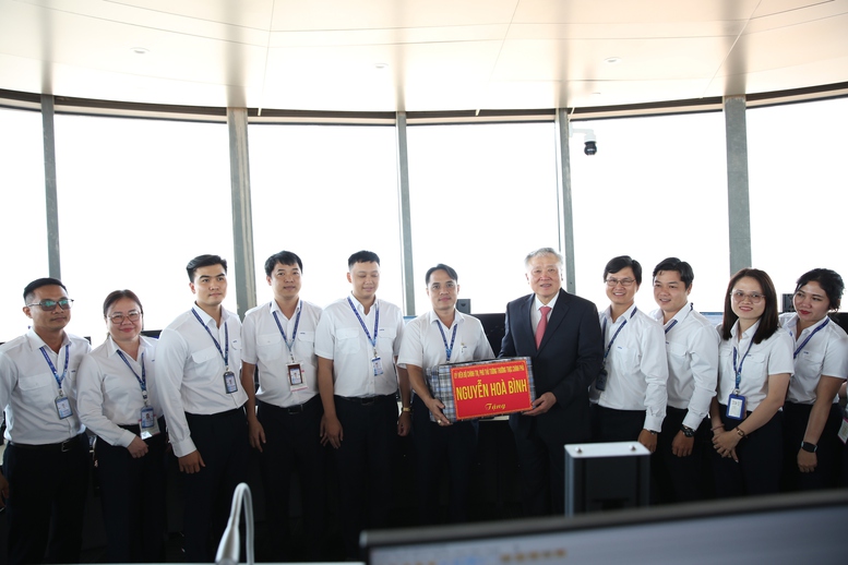 Phó Thủ tướng Thường trực Nguyễn Hòa Bình tặng quà cán bộ, nhân viên đài kiểm soát không lưu tại Sân bay Long Thành - Ảnh: VGP/Nguyễn Hoàng
