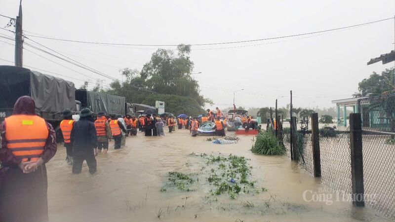 Cán bộ, chiến sĩ Quân khu 5 tiếp tế lương thực, nước ngọt cho các địa phương bị lũ cô lập, chia cắt, mất điện, mất nước.