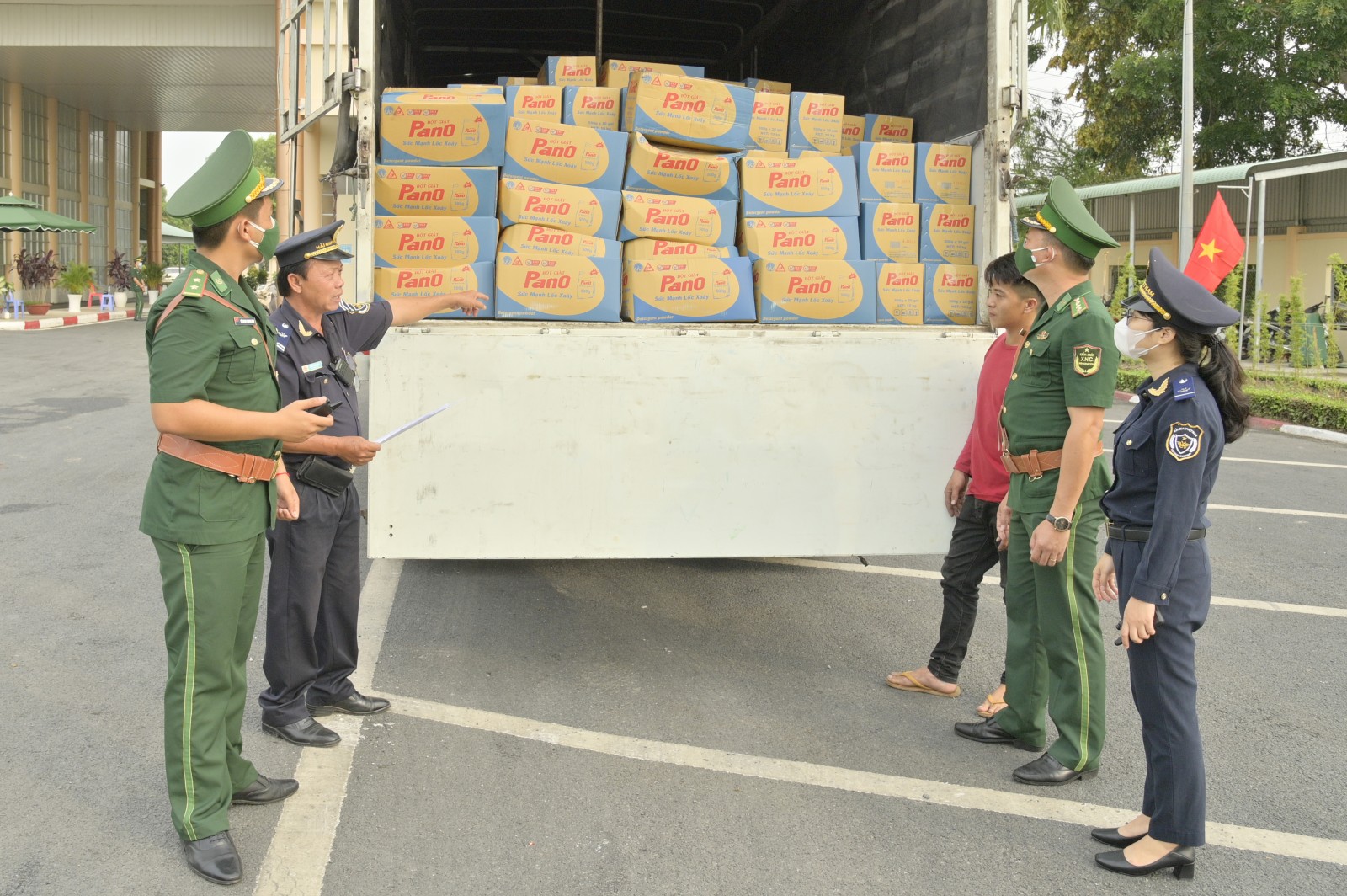 Cán bộ Biên phòng và Hải quan Cửa khẩu quốc tế Tịnh Biên kiểm tra hàng hóa qua lại cửa khẩu.