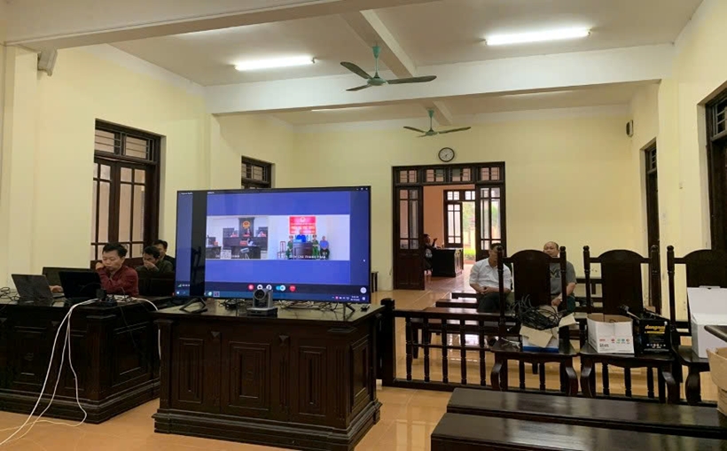 Phiên tòa trực tuyến tại điểm cầu Trung tâm ở TAND Khu vực 7 .