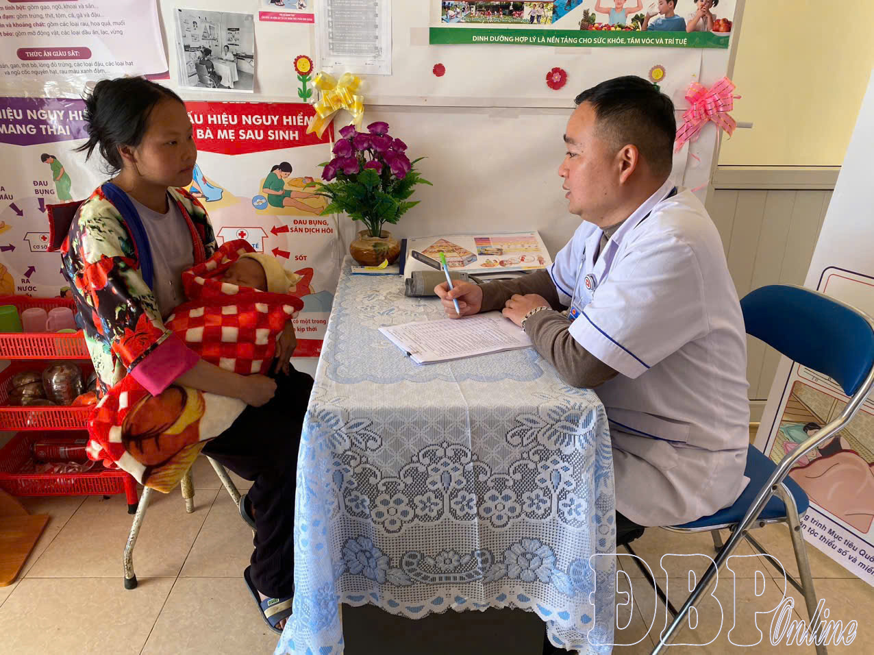Cán bộ Trạm Y tế xã Sính Phình tuyên truyền cách phòng bệnh ho gà cho người dân.