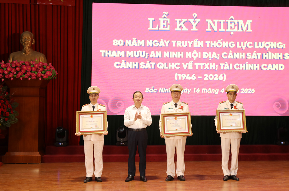 Trước đó, tại lễ kỷ niệm thành lập lực lượng mới đây, Thượng tá Lại Minh Tiến, Trưởng Phòng Cảnh sát điều tra tội phạm về trật tự xã hội, Công an tỉnh Bắc Ninh (ngoài cùng bên trái) nhận Huân chương Chiến công hạng Ba.