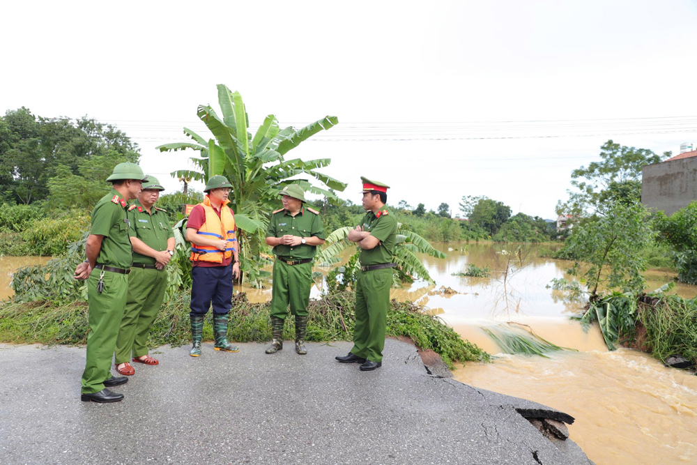 Đại tá Trần Thế Cường, Phó Giám đốc Công an tỉnh (thứ 2 bên phải) kiểm tra công tác cứu nạn, cứu hộ tại các xã khu vực huyện Yên Thế (cũ).