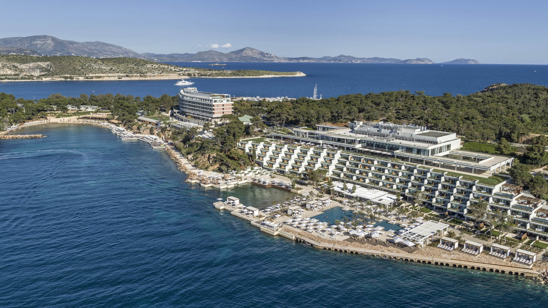 Tọa lạc trên bán đảo riêng của Athenian Riviera, khu nghỉ dưỡng rộng hơn 30 ha với bãi biển riêng và vườn thông ven biển. Các phòng và suite đều có ban công hướng ra Saronic Gulf. Từ đây, du khách có thể dễ dàng tham quan những di sản nổi tiếng của Athens như Acropolis, rồi trở về nghỉ dưỡng trong không gian sang trọng bên bờ Địa Trung Hải.