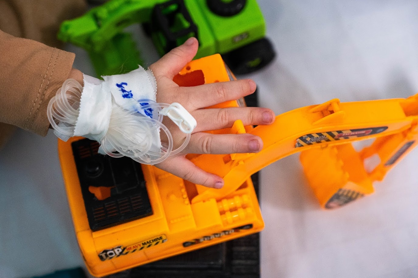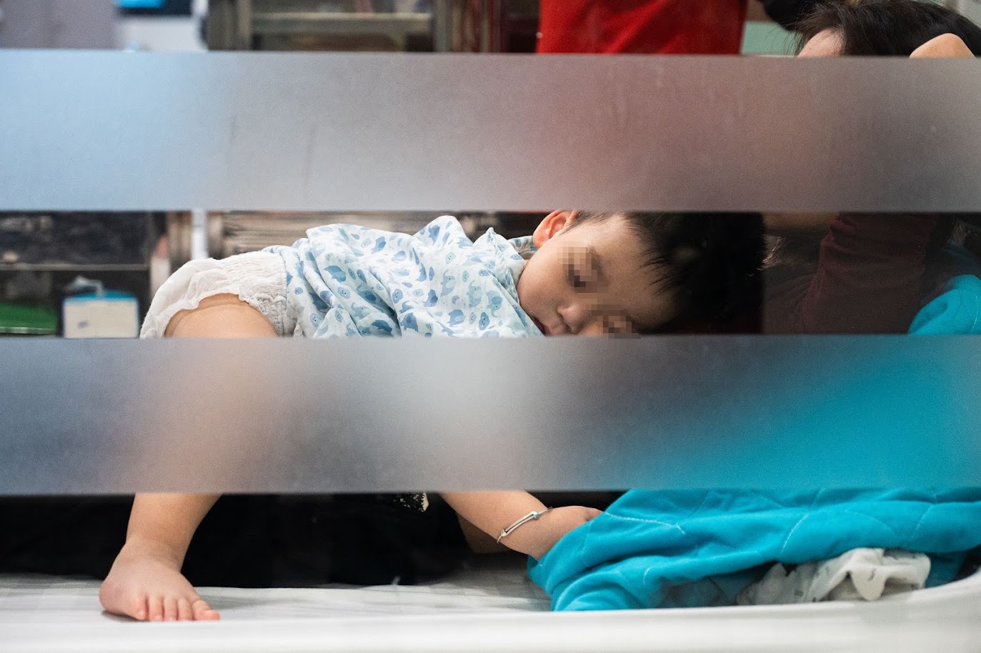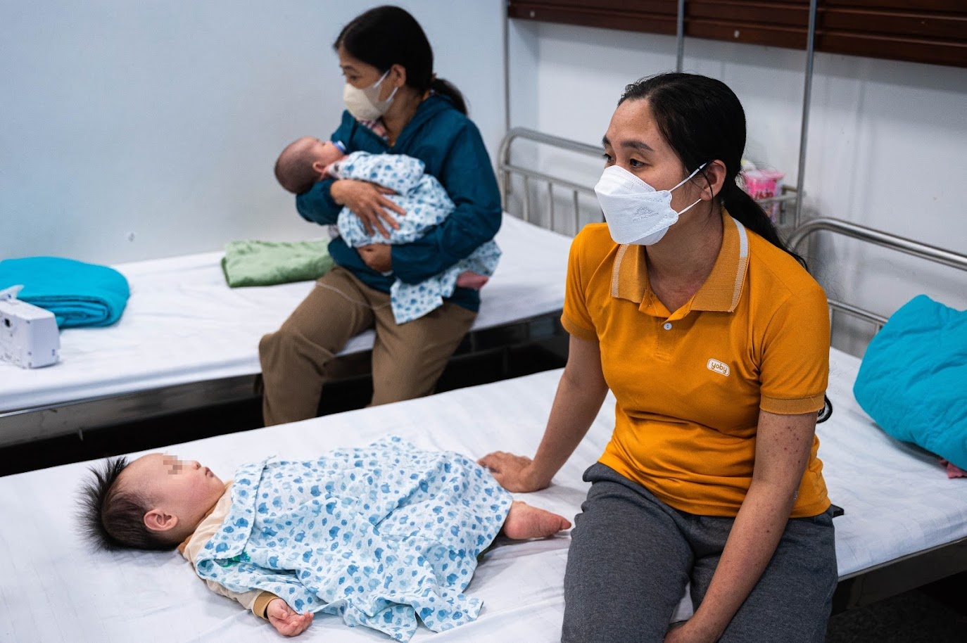 Nằm cùng phòng với bé Huy, chị Trần Thị Yến (Nội Bài, Hà Nội) vừa bế con trai Trần Phú Trường (2 tuổi) vừa giúp bé dùng máy khí rung dung đưa thuốc dạng sương mù vào đường hô hấp. Bé Trường đã nhập viện ngày thứ 3. Trước đó, bệnh nhi có 3 ngày ho liên tục, sốt cao, ngủ li bì, chị Yến đã tự cho con dùng thuốc hạ sốt nhưng không hạ. Khi nhập viện, các bác sĩ chẩn đoán bé mắc cúm A kèm biến chứng viêm phổi. Hiện trẻ tỉnh táo, có thể ngồi dậy chơi, khiến mẹ thở phào nhẹ nhõm.