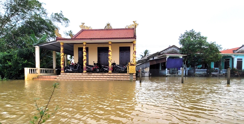 Con đường dẫn vào TDP Phú Lộc và Ma Nê vẫn chìm sâu trong nước. Từ xa chỉ thấy những mái nhà thấp thoáng giữa nền trời xám và mặt nước loang loáng. Chiếc xuồng máy của công an phường do anh Lê Phước Quốc - công an viên đứng mũi đưa tôi đến TDP Phú Lộc. Vừa đến nơi tôi thấy một vài người dân vẫn đi lại bằng ghe, chuyền tay nhau từng bó rau, mớ cá. Một số khác đứng trên các bậc thềm nhà cao cười nói giữa cảnh nước ngập quanh nhà. Nhiều ngôi nhà phía sau nước ngập lên gần cửa sổ đã sơ tán lên chỗ cao từ những ngày trước. “Mấy năm nay, cứ đến mùa mưa là chuẩn bị xuồng ghe, lương thực, nước uống trước sinh hoạt trên tầng hai, hoặc trên tra (gác) dưới nóc nhà”, anh Lê Phước Quốc vừa đẩy thuyền vào trú khu vực an toàn ở TDP Phú Lộc.