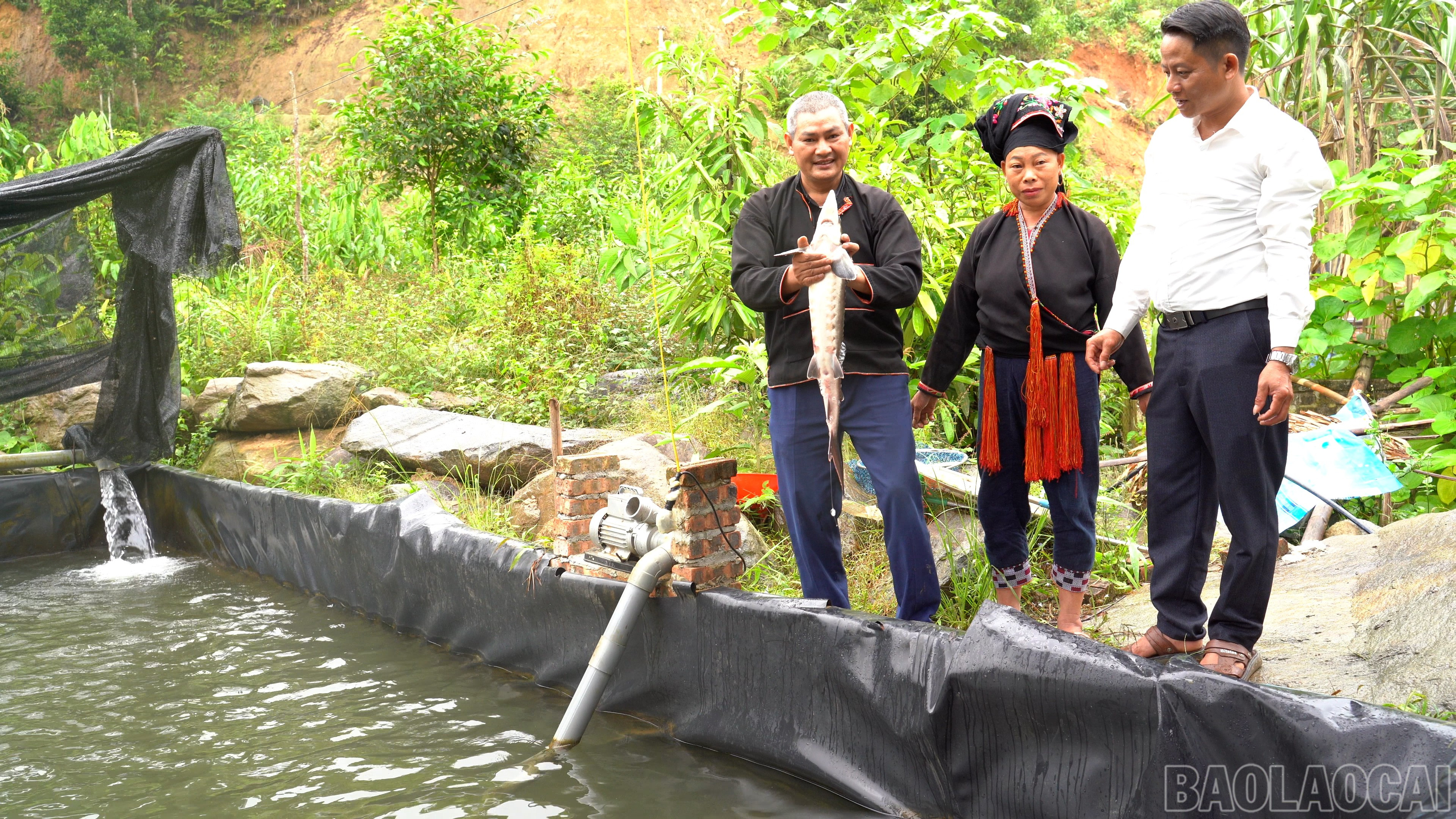Lãnh đạo địa phương kiểm tra mô hình nuôi cá tầm nước lạnh tại thôn Khe Mạ.
