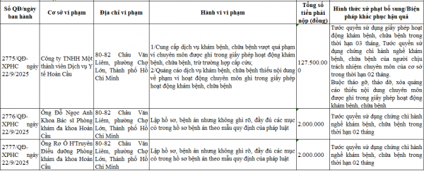 Bên cạnh đó, bác sĩ Đỗ Ngọc Anh Khoa và điều dưỡng Rơ Ô H'Truyên thuộc PKĐK Hoàn Cầu cũng bị phạt mỗi người 2 triệu đồng, đồng thời bị tước quyền sử dụng chứng chỉ hành nghề KCB trong thời hạn 2 tháng.